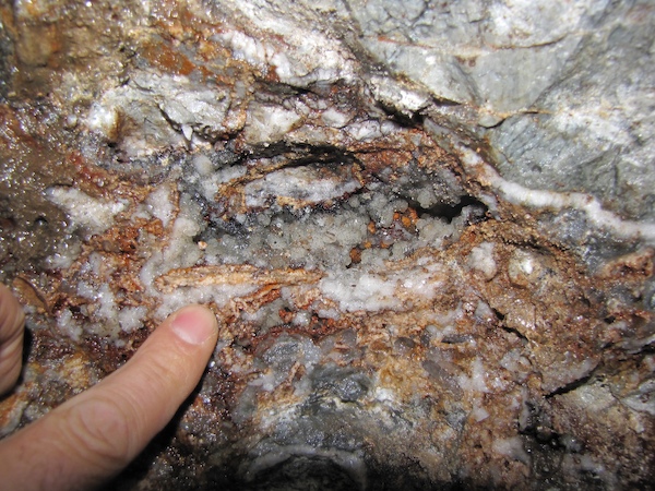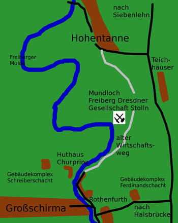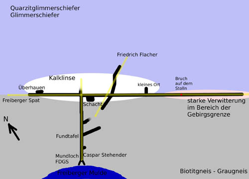 Wieder aufgefunden wurde das Stollnmundloch durch den Bau eines besonderen Stollns. Anfang der Neunziger Jahre, der großen Zeit der westdeutschen Glücksritter und Geschäftemacher, entsann man sich der „großen Not“ der hiesigen Bewohner durch das Fehlen einer Kläranlage. Dazu wählte man den wohl ungünstigsten Standort mit den größten finanziellen Aufwendungen durch ein Übermaß an vorhandenen Fördermitteln aus. Das investierte Geld kann man sich ja später zigfach vom deutschen Michel, in diesem Falle den Einheimischen, in Form der Entsorgungsbeiträge wieder zurückholen. Im Muldental unterhalb des Ortes Hohentanne baute man eine Kläranlage in einer Größe, wie sie eine Stadt benötigt. Doch eine Stadt lag nicht in der Nähe. Um die „Notdurft“ der Einheimischen in die Kläranlage zu bekommen, musste ein Tunnel für die Abwasserleitung durch das Hohentanner Gebirge getrieben werden. Da es aber keine Bergleute, kein bergmännisches Knowhow und vor allem keine Bergbaubetriebe mehr im neuen Staat gab, musste eine Fachfirma aus Österreich die Auffahrungsarbeiten durchführen. Im Vorfeld der Altbergbauerkundung wurde der „Freiberg Dresdner Gesellschaft Stolln“ (kurz „FDGS“) freigelegt und erkundet. Da von ihm keine Gefahr für das „Scheißetunnelprojekt“ ausging, wurde auf eine damals leider oft typische „steuergeldlich finanzierte oberbergamtliche Betonorgie“ verzichtet. Den Verantwortlichen muß man für diese Weitsicht in ihrer Handlungsweise noch heute danken und auch die Fledermäuse tun das erst recht ! Bekannt und dominierend war in diesem Gebiet die Grube „Churprinz Friedrich August“ zu Großschirma, deren Tagesanlagen in Sichtweite des „FDGS“ lagen. Doch ist der Bergbau in diesem Gebäude nicht vom „Churprinz“ betrieben wurden. Viel mehr handelt es sich wohl um den typischen Bauernbergbau für den Kalk oder auch kleingewerkschaftlichen Communbergbau mit entsprechenden Steuervergünstigungen, wie er für das ausgehende 18. Jahrhundert markant war. Der „FDGS“ ist in einem tektonisch stark beanspruchten Bereich aufgefahren, zumindest auf dem „Freiberger Spat“. Dieser Spat verläuft im Bereich der Gebirgsgrenze zwischen dem Biotitgneis und dem Quarzglimmerschiefer von Hohentanne. Wobei diese Grenze als durch Wechsellagerung beider Gesteine, starke Verwitterung und des eingeschalteten Dolomitmarmors gezeichnet ist. In diesem Grenzbereich erstreckt sich auf etwa 300 m Länge eine sich nach oben auf weitende Linse von schwarzgrauen – hellgrauen kristallinen Dolomitmarmor mit Schlieren, Nestern und größeren gangförmigen Einlagerungen von grauweißen – weißen ebenfalls kristallinen Dolomitmarmor. Das Lager war außerdem noch mit anderen Beimengungen wie Biotit, Chlorit, Muskovit, Galenit und Pyrit imprägniert was den Kalkstein als Grundstoff für Bau- und Düngekalk stark einschränkte. Der Kalkstein ist im Stollnbereich nur nordöstlich des „Freiberger Spates“ sichtbar, muss aber zur Tagesoberfläche hin sich auf weiten, belegt durch Bereiche des teilweise fahrbaren Kalklagers und ist wohl früher auch von der Tagesoberfläche her über Schürfe, Gruben oder ähnliches aufgeschlossen worden. Bei dem Gneis handelt es sich um Biotitgneise, den sogenannten Graugneisen. Diese bestehen vorwiegend aus Orthoklas, Oglioklas, Biotit, sowie untergeordnet noch Muskovit, Turmalin und Granat zusammen. Der Glimmerschiefer oder auch Quarzitglimmerschiefer ist eine dick – dünnbankige Gesteinsmasse, die farblich vom eingeschalteten dunklen Dolomitmarmor sich nur an der Struktur unterscheidet. Bereiche des Schiefers die durch Klüfte und Gänge gestört werden sind starke Zersetzung und Verwitterung stark auffällig, die stellenweise zu starken Ablösen und unfahrbaren Verbrüchen im Bereich des „Freiberger Spates“ führten. In diesen Bereichen ist der Glimmerschiefer auch mit Schwefelkies und Eisenoxyden imprägniert, die die oben erwähnte Zersetzung forcieren. Geschichtlich ist über diesen Bergbau recht wenig in der Primärliteratur zu finden. Vermutlich ist das Auffinden des „Freiberger Spates“ nur dem Kalkbergbau zu verdanken. Da im Bereich des Kalklagers immer wieder Funde von Erz wie Pyrit und Bleiglanz gemacht wurden, lag die Vermutung nach einem vorhandenen bauwürdigen Erzgang im Streichen des Kalklagers recht nahe. Zumal auch der Freiberger Spat, zumindest im nordwestlichen Bereich in das Kalklager hineinreicht und womöglich auch dort zu tage ausstreicht. Im übertägigen Bereich des Kalklagers sind außer einigen minder großen und kleinen verstreut liegenden Halden am Berggehänge und an einer leicht fallenden plateauartigen Fläche nicht viel zu sehen. Weder Reste eines Kalkofens oder der Standort von Gebäuden sind so richtig zu erkennen. Allerdings sind alte Kulturhölzer, Wiesenraine und verwischte Wege erkennbar. Erreichbar ist das Areal über einen alten passierbaren Wirtschaftsweg von Rothenfurth nach Hohentanne. Hinweise auf den Standort eines Kalkofens sind auf der Weinhold'schen Gangkarte zu sehen. In der geologischen Beschreibung der Sektion Freiberg – Langhennersdorf wird dieser Bergbau als schon lange erloschen benannt. Es kommt die Vermutung auf, das zu Zeiten der Auffahrung des „FDGS“ noch der Kalkabbau in Umgang war und die Stollnauffahrung auch eine Wasserrlöse für das Kalklager darstellte.