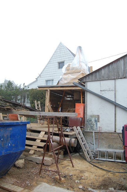 ![]() Vom Vorgarten war bei diesen Arbeiten nicht mehr viel zu erkennen. Auch der Apfelbaum musste „Federn“ lassen. |