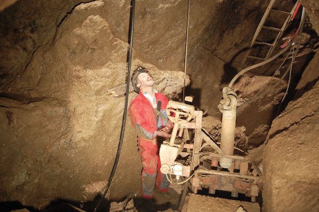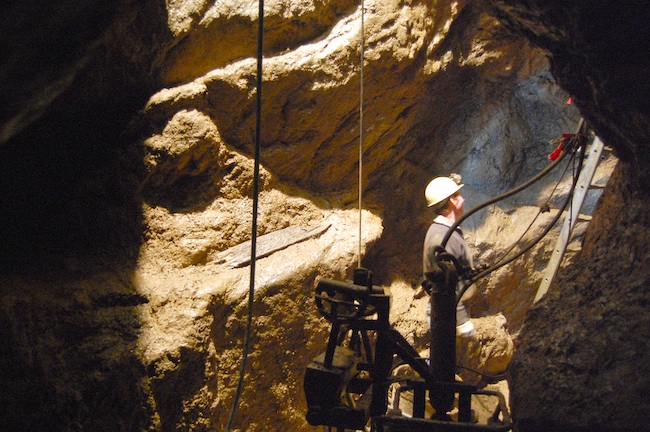 ![]() Hier am Stoß die Spuren der Bohr- und Schießarbeit in Form von großen und sehr langen Bohrlöchern, die auf zweimänniges Bohren schließen lassen. |