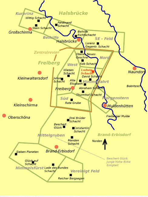 ![]() Die Lage des „Ludwigschachtes“ im „Himmelfahrter Revier“. Erhalten ist heute nur noch die Halde und eine teilweise offene von der Rösche zugängige Radstube des Kunstrades. Sämtliche Gebäude der Schachtanlage sind abgerissen. |