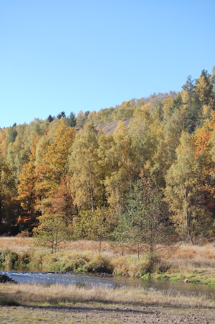 ![]() Heute ist die mächtige Halde des „Ludwigschachtes“ stark verwachsen. Der Haldensturz ist zwischen den Baumwipfeln sichtbar. Die Aufnahmen entstand im Herbst 2012 am Standort der „Hilliger Hütte“ im Muldental. |
