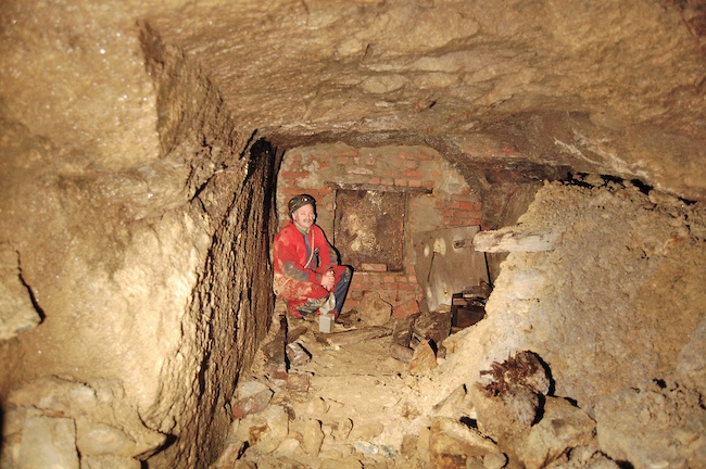 ![]() Blick in die gut zur Hälfte verfüllte Kunstradstube des „Ludwigschachtes“. Die Bergemasse in der Radstube erreicht die Höhe der Radwelle. |