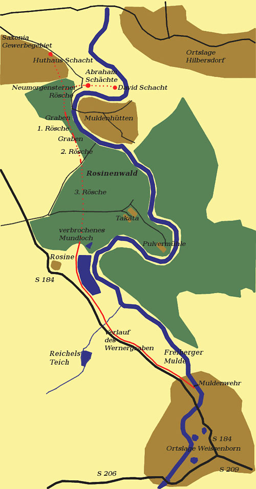 Diese wassertechnische Einrichtung des Sächsischen Bergbaus stand immer etwas im Schatten anderer großer bekannter Bauwerke. Auch ist von den Gruben, denen diese Einrichtung einen großen Nutzen brachte, zumindest übertägig nichts mehr in der Landschaft sichtbar; alles ist geschliffen oder unter einer riesigen Industriemüllkippe verschwunden. Der „Werner Stolln“ ist heute noch untertage im Bereich der so genannten „Neumorgensterner Rösche“ vollständig erhalten. Auch sind fast alle Röschenmundlöcher intakt und der Grabenverlauf von Muldenhütten bis zur Rösche am Rosinenwald ist noch gut erhalten. Ebenso das gemauerte Muldenwehr in Weissenborn. Aber dazu mehr an anderer Stelle. Für dieses Bauwerk kursieren heutzutage verschiedene Namen. Der richtige Namen lautet eigentlich „Werner Stolln“. Doch weil diese wassertechnische Einrichtung aus verschiedenen Komponenten besteht, wie Gräben und Röschen, ist der Name „Stolln“ eher unzutreffend. Deshalb auch die vielen Versionen wie „Wernerstolln- Wasserleitung“, „Wernerrösche“ usw. Wir haben uns daher entschlossen, dieses Bauwerk auch weiterhin in seiner Gesamtheit als „Werner Stolln“ zu bezeichnen. Einzig als „Stolln“ würde die „Neumorgensterner Rösche“ bestehen und deshalb haben wohl auch schon die „Alten“ diesen Komplex als „Werner Stolln“ bezeichnet, obwohl dies eben auch nur eine „Rösche“ ist. Dabei ist die Namensgebung eigentlich einer Person gewidmet, Abraham Gottlob Werner. Nachstehende Beschreibung der Wernerstolln- Wasserleitung ist im Jahrbuch für den „Berg- und Hütten-Mann“ auf das Jahr 1863 enthalten und soll hier - mit Anmerkungen und Erklärungen - vollständig wiedergegeben werden. Eine bessere Beschreibung dieser wassertechnischen Einrichtung des Freiberger Bergbaus können auch wir nicht abliefern und warum sollen wir das Fahrrad auch zweimal erfinden...