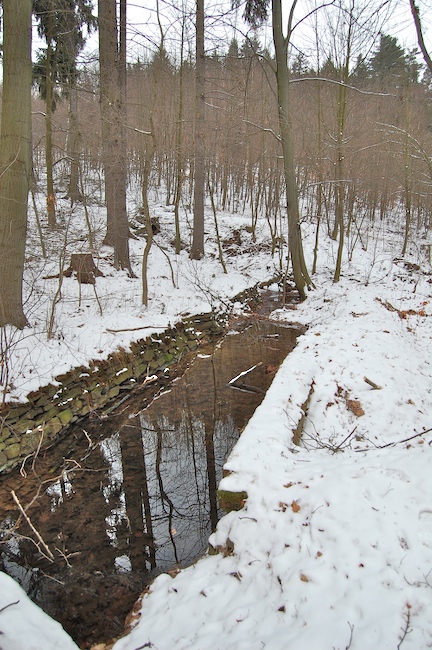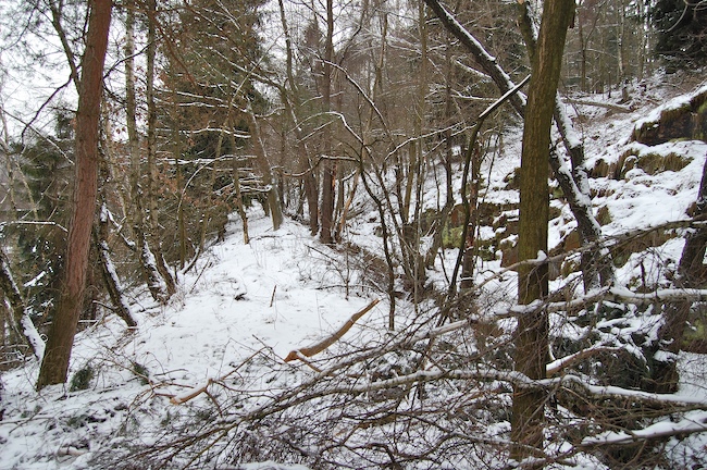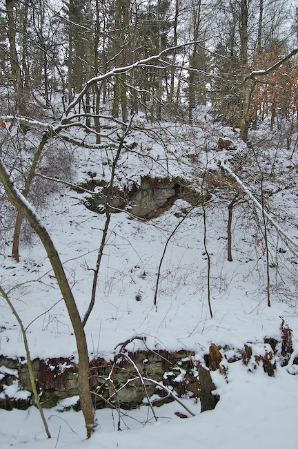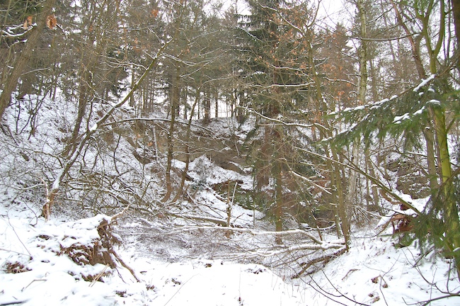 ![]() Im Verlauf des Kunstgrabens finden sich überall kleine und große Steinbrüche. Sie stammen wohl noch von der Werksteingewinnung für das Wernerstolln-Projekt. |