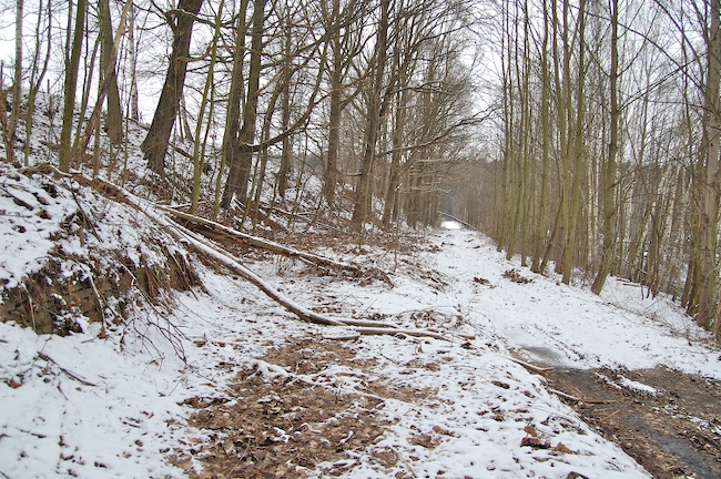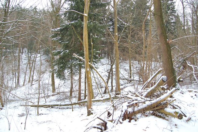 ![]() Blick zurück zur Straßenquerung und dem Mundloch der Straßenrösche. Von hier an verläuft der „Werner Stolln“ durch den Rosinenwald in Richtung Weißenborn und tritt erst wieder am Waldsaum zutage. |