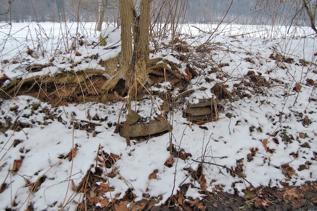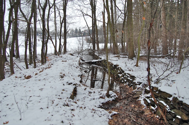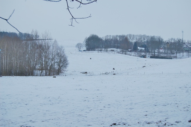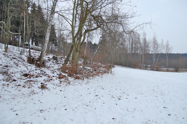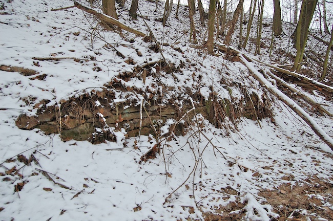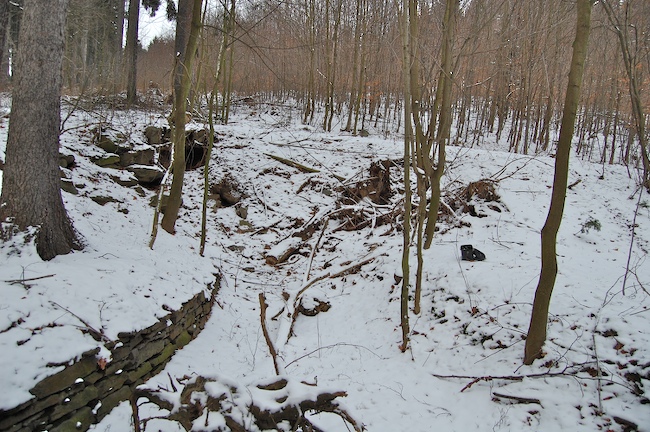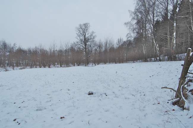 ![]() Nach dem Teich ist der ehemalige Grabenverlauf nur als schwache Kontur mit viel Phantasie zu erahnen. Ebenso schauen an einigen Stellen noch Bruchsteine aus der mit Schnee bedeckten Grasnarbe. Man musste aber richtig danach suchen... |