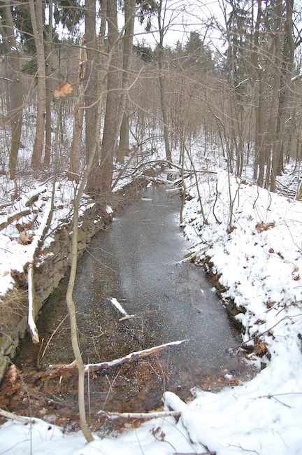 ![]() Im Verlauf des verröschten Wasserlaufs kündigt eine mächtige Halde schon das nächste untertägige Bauwerk des „Werner Stolln“ an. |
