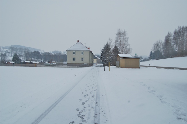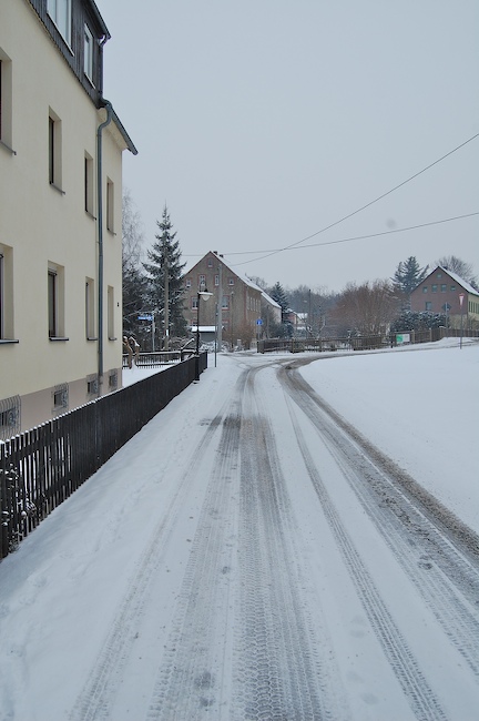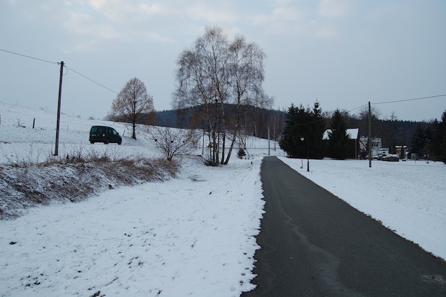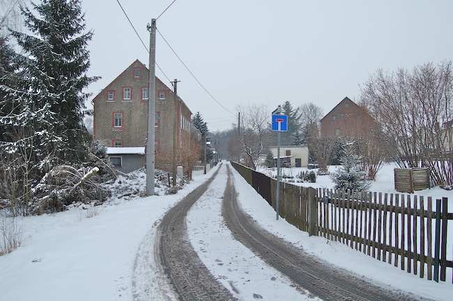 ![]() Blick zurück zum Ortseingang Weißenborn. Zwischen Staatsstraße und asphaltierten Fahrweg verlief der Graben und ist teilweise noch als Negativ erahnbar. |