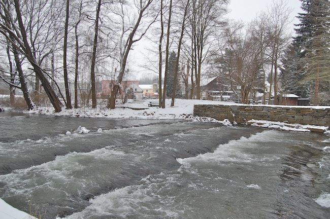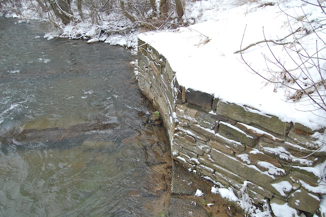 ![]() Bacheinlauf unterhalb des Wehres mit einer - der Fließrichtung geschuldet - gekrümmten Mauerung. |