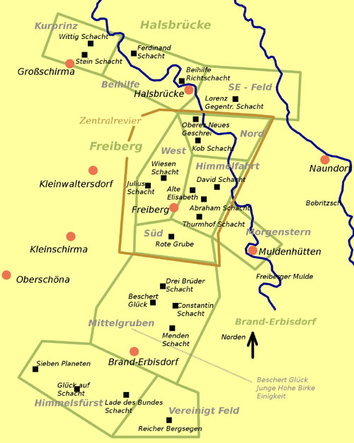 die drei anderen Felder wurden nur nach den Himmelsrichtungen bezeichnet. Heute wird nur noch der zentrale Teil von „Himmelfahrt Fundgrube“ auch umgangssprachlich als Zentralrevier bezeichnet. Dies resultiert zum einen aus dem Umstand, daß man von einem Punkt aus untertage sämtliche wichtigen Schächte, Streckenauffahrungen und auch die Stolln, die oberhalb des „Rothschönberger Stolln“ verlaufen, erreichen kann. Als wichtige Eckpunkte des Zentralreviers sin folgende Schächte anzusehen : „Ludwigschacht“, „Kobschacht“, „Reiche Zeche Richtschacht“, „Alte Elisabeth Schacht“ und „Thurmhof Schacht“. Zum anderen markieren diese Eckpunkte auch die etwaige Betriebsgrenze des heutigen Lehr- und Besucherbergwerks „Himmelfahrt Fundgrube“.