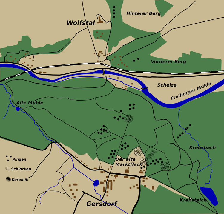 Typisch für den Gersdorfer Bergbau ist das Fehlen aussagekräftiger urkundlicher Belege für Bergbau und Besiedlung während dieser frühen Zeit. In den klösterlichen Urkunden finden sich nur sehr vereinzelt Hinweise auf den Bergbau oder dessen betreffende rechtliche Handlungen. Dies betrifft nicht nur Altzella, sondern auch Klöster in ganz anderen Landesteilen von Sachsen. Man könnte meinen, daß der Bergbau mit zum „Tagesgeschäft“ der jeweiligen Klöster gehörte, was bei der Bautätigkeit der Klosterbrüder kaum von der Hand zu weisen ist. Denn wo kamen denn die vielen Baumaterialien her, die zur Errichtung „fester Gebäude“, so wie es die Bibel fordert: „Baue dem Herrn ein festes Haus“, gebraucht wurden? Neben Bruchstein sind auch Backsteine und Mörtel zum Bau in Altzella verwendet worden. Mit Kalkmörtel geputzte Wände, die mit Kalkfarben verziert waren. An dieser Stelle muß man meinen, daß die Klosterbrüder selber Bergbau zur Gewinnung von Sand, Lehm und Kalk betrieben haben und sich die erforderlichen Baumaterialien selber beschafft haben. Da Berbersdorf schon zum frühen Stiftungsbesitz gehörte und somit das ausstreichende Kalkvorkommen von Kaltofen zur Verfügung stand, ist diese Vermutung naheliegend. Weiterhin erwarb das Kloster Altzella gegen Ende des 13. Jahrhundert das komplette Kalkvorkommen von Kaltofen- Berbersdorf durch einen gezielten Ankauf über Dritte. Damit unterschied sich das Bauwesen der Klosterbrüder vehement von der übrigen Besiedlung! Die nur aus eingetieften Hütten – sogenannte Grubenhäuser – oder einigen wenigen ebenerdigen Holzhäusern bestanden haben! Forschungsarbeiten zum Thema Bergbau und Besiedlung sind damit ausschließlich archäologischer Natur. Der hiesige Bergbau wird nach den derzeit angewandten Chronologien und auch nach Münzfunden zeitlich in das frühe 13. Jahrhundert eingeordnet. Diese Annahme bezieht sich auf die Funde der graublauen Keramikware und besonders einiger Henkelformen. Dabei nimmt man Bezug auf den sogenannten „Wursthenkel“, welcher schon in früherer Zeit auftrat, aber um die Mitte des 13. Jahrhunderts angeblich wieder „Mode“ wurde. Aufgrund dieser Siedlungsfunde datiert der Beginn laut den Belegen in die 1. Hälfte des 13. Jahrhunderts. Dies wird auch durch den Umstand untermauert, daß die Gefäße mehrheitlich abgehoben und nicht von der Töpferscheibe geschnitten wurden. Bei den Grabungen ist ebenso ein recht großer Schlackenplatz, etwas unterhalb des „Marktfleckes“ über eine Fläche von etwa 40 m Durchmesser, vorgefunden worden. Das Anstehende war demnach mit einer 50 cm mächtigen Schicht aus Asche, Schlacke, Holzkohle und auch Keramik bedeckt. Es handelte sich aber um die Reste eines Schmiedeplatzes. Nur an einer Stelle ist Schlacke aus der Bleiverhüttung nachgewiesen worden. Ein weiterer alter Verhüttungsplatz soll im Bereich der „Schelze“ vorhanden sein, konnte aber bisher archäologisch nicht nachgewiesen werden. Lediglich eine Erwähnung im Bergbelehnungsbuch für das Jahr 1610 spricht dafür. Bei der „Schelze“ handelt es sich um die sogenannte „Schulzenaue“ am rechten Ufer der Freiberger Mulde gegenüber der Krebsbachmündung. Eine weitere, wesentlich ältere Schmelzhütte ist für Böhrigen rechts der Striegis an der Einmündung des Klimmbaches, beim sogenannten „Klosterhof Bore“ belegt. Es wird daher angenommen, daß man hier ausschließlich die Gersdorfer Erze verhüttet hat. Zumal der Bergbau der Umgebung von Böhrigen kaum diese Erzmengen für den Betrieb einer Hütte liefern konnte. Der Hüttenstandort ist bis in die heutige Zeit bekannt gewesen. Bei der Rodung der sogenannten Schlackenbüsche um 1869/70 für neues Feld sind auch 5 silberne Brakteaten gefunden worden und belegen damit für diesen Schmelzhüttenstandort den Betrieb während des Mittelalters. Vergessen sollten wir auch nicht, daß die Böhrigener Hütte in dieser Zeit die einzig urkundlich belegte Schmelzhütte für Sachsen war, deren Standort lokalisiert werden konnte. 1996 wurde hier eine Kläranlage errichtet und trotz vieler aufgefundener Artefakte während der gesamten Bauarbeiten unterblieb eine Untersuchung durch das Landesamt für Archäologie von Sachsen! (Schwabenicky)