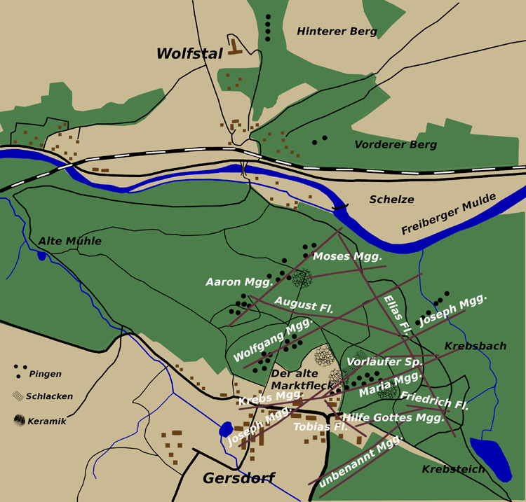 sehr bekannt, sehr ausführlich befaßt. Der Gangzug der barytischen Blei- und Silberformation bei Rosswein und Gersdorf. „Eine kleine und minder wichtige Gruppe von Gängen der barytischen Blei- und Silberformation ist in der Granulitformation (Granulitkomplex – Anm. d. Red.) und in der obersten Stufe dieser, dem Gabbro der Gegend von Rosswein, Gersdorf und Etzdorf, durch Bergbau erschlossen worden. Es gehören zu diesen die zum Theil schon im 13. Jahrhundert bebauten, aber längst auflässigen Gänge der Gruben am rechten Muldengehänge: