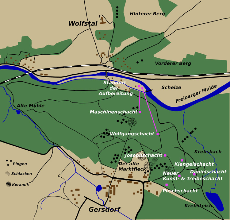 ![]() Lage der Bergbausiedlung und der früheren Grubenfelder anhand der vermerkten Pingen.