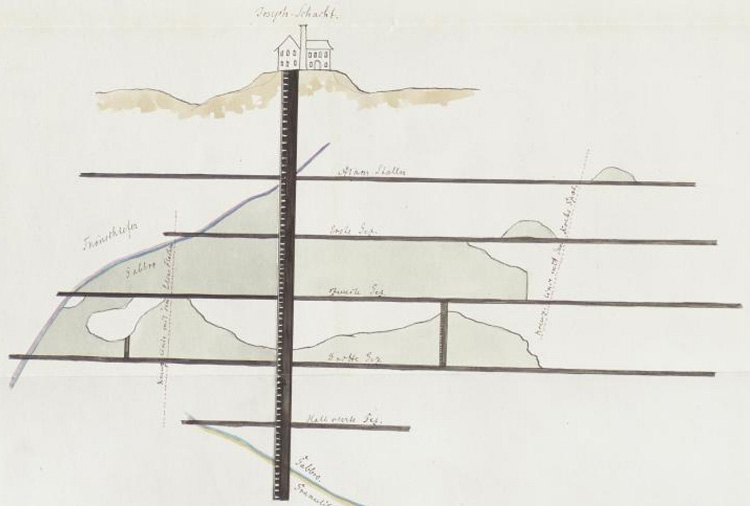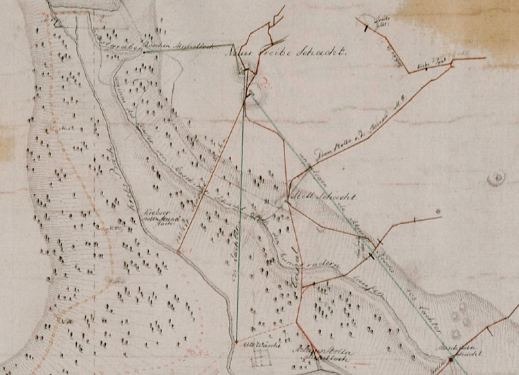 ![]() In dieser Skizze sind die wichtigsten Schächte sowie zweier Feldgestänge des 18./19. Jahrhundert vermerkt.