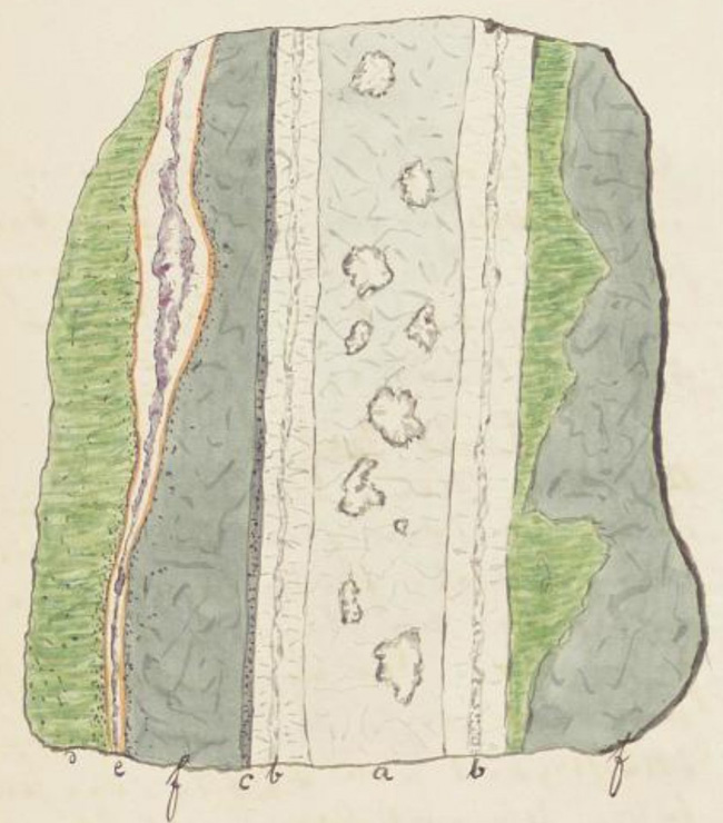 a) Gabbro b) Weisser Quarz mit rothen Schwerspatadern und Nestern von Kiesen, sowie auch einigen Grünsteinfragmenten c) grauer Quarz mit Kiesen d) weisser Quarz mit inneliegenden grauen Quarzkristallen f) viele Gabbrofragmente durch weisse und rothe schmale Quarztrümer verkittet. Im weissen Quarz finden sich oft mit rother Einfassung versehene Drusen, die mit Quarzkristallen besetzt sind, und angesprengt ist Schwefelkies.“