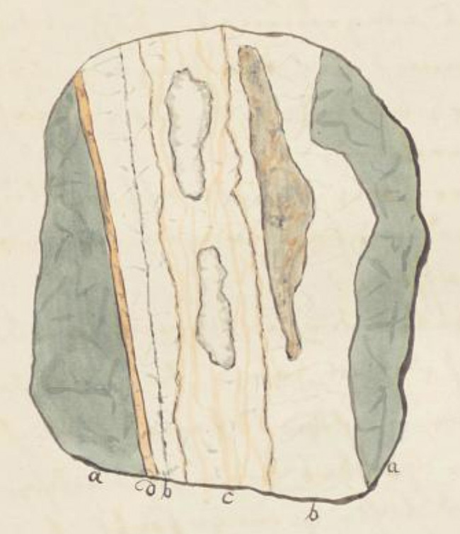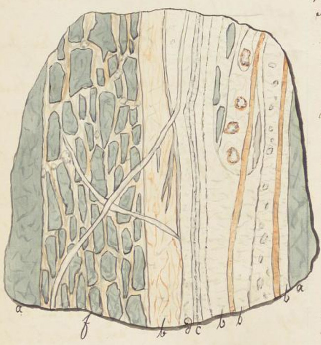 Auch zu diesem haben wir bei C. A. Hering einen Abschnitt gefunden: „15. Beistehendes Gangbild (befindet sich jetzt unter diesem Abschnitt – Anm. d. Red.) zeigt die Gangstruktur des Wolfgang Morgenganges auf ½ 2. Gezeugstrecke. Es bedeutet: a) Gabbro b) weisser Quarz c) weisser Quarz mit rothen Schwerspatadern d) Schwerspat e) rother und grauer Quarz mit eingesprengtem Schwefelkies.“