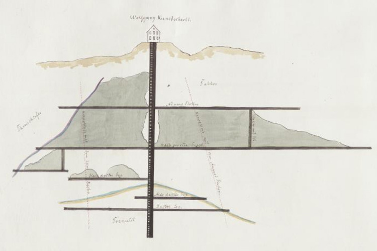 1) eine Bergfeste über der 3ten Gezeugstreckesohle, von ½ Fahrt, oder 1 ⅝ Lachter Stärcke durch diesen ganzen erlängten Stroßenbau stehen zu laßen, und damit das Gebäude in Sicherheit zu setzen, auch 2) die jezigen großen beträchtlichen Stroßen in einem Firstenbau zu verwandeln, und endlich 3) die große und schwerköstige Zimmerung damit zu erspahren. Die Gänge auf diesem beträchtlich längsten Stroßenbau, so wie auch vor gleich erwähntem Orte sind von ½ bis 1 ½ Lachter Mächtigkeit, bestehend aus Fluß, Schwerer Spat, mit derben und einbrechenden Bley Glanz und Fahlerz.“ An diesem Abschnitt können wir herauslesen, daß die vorwiegende Abbauart im 18. Jahrhundert, und natürlich auch davor, noch der Strossenbau gewesen ist und diese Abbauart nunmehr Probleme mit der Stabilität des Gebirges brachte. Die beachtlichen Gangmächtigkeiten von 1 – 3 m und mehr erfordern bei der zunehmenden Tiefe des Abbaus einen sicheren Ausbau oder entsprechende Ausbauarten.