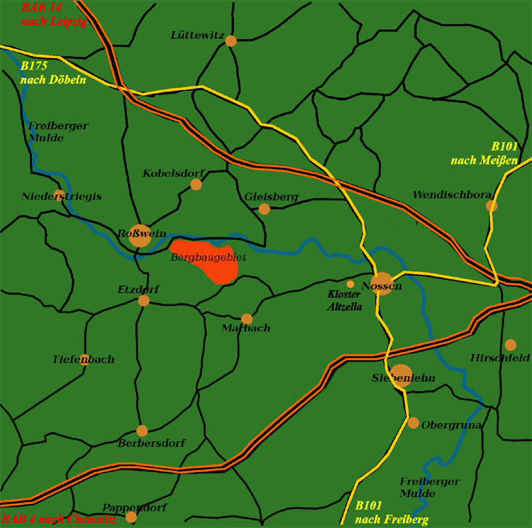 ![]() Rot markiert die geografische Lage des Bergbauareals zwischen Roßwein und Nossen linksseitig der Freiberger Mulde.