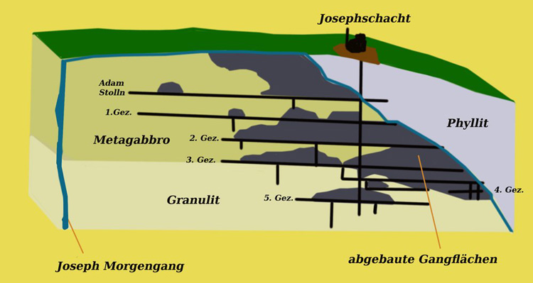 ![]() Wie oben von Bergacademist Hering angeführt, werden sämtliche Gänge an der Gebirgsscheide von Gabbro zum Phyllit (Thonschiefer) abgeschnitten: In den Flachrissen zum Joseph- und Wolfgangschacht von Hering vom Jahr 1864 gut dargestellt anhand der lindgrün gefärbten Abbauflächen. Link zum Digitalisat: