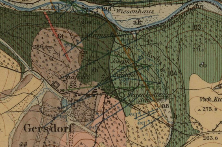 Aus diesem Bericht wollen wir folgende Passagen zum Thema Erzgänge in Gersdorf in diesen Abschnitt mit übernehmen: „Die Erzlagerstätten der Grube Segen Gottes Erbstolln zu Gersdorf. Als Ueberbleibsel was einst weiter ausgedehnten Bergbaues auf den in dem Gabbrogebiet, das mich im Vorhergehenden beschäftigt hat, vorkommenden Erzlagerstätten ist der Bergbau der Grube Segen Gottes Erbstolln zu Gersdorf. Von jeher scheint man mit dem Abbau der Erzlagerstätten nur soweit gegangen zu sein als man noch dem Gabbro zum Nebengestein hatte, was seine Begründung darin sucht, dass die Gänge als Träger von Erzen sich nur im Gabbro bewährten, währenddem sie in ihren Fortsetzungen im Thonschiefer sich vielfältig zertrümern oder im Granit zuweilen ganz abgeschnitten erscheinen. Es scheint hernach, dass die Gänge nur im Gabbro Erze führen, während sie im Thonschiefer sehr erzarm und im Granulit, da wo sie in diesem Fortsezen, ganz erzleer sind, doch scheint das eben nur, bewiesen ist es jedoch nicht, denn man ist weder in den Thonschiefer noch in den Granulit mit Untersuchungsbauen vorgegangen, sondern hat sich lediglich auf 1 bis 2 Lachter Vorgehen beschränkt und da man nichts gefunden, die weitere Untersuchung eingestellt. Die Möglichkeit das die Gänge auch im Thonschiefer und Granulit weiter von der Contaktgrenze entfernt wieder erzführend werden, scheint mir nicht ganz ausgeschlossen zu sein, doch wäre dem wirklich so, so hätten wir für die Gersdorfer Erzgänge ein schönes Prinzip von neuer Lateral- Sukration (seitliche Annahme – Anm. d. Red.), wofür in der That auch Uebersicht was ich in dem mehrern Notizen anführen werde. Die eigentlichen Träger der Erze sind die Morgengänge, welche wenn in seiner Mehrheit nach auch erforschte (?) Gangzüge bilden; nechstdem sind einige Spatgänge, besonders der Segen Gottes Spat, in früheren Zeiten sehr erzreich gewesen. Als Wegweiser oder als Schlüssel zu den Erzgängen dienen die flachen Gänge. Als allgemeine Regeln, welche die … aportatiori (vermutlich Nacktheit – Anm. d. Red.) beobachten, gelten in Betreff der Erzführung der Gänge folgende: