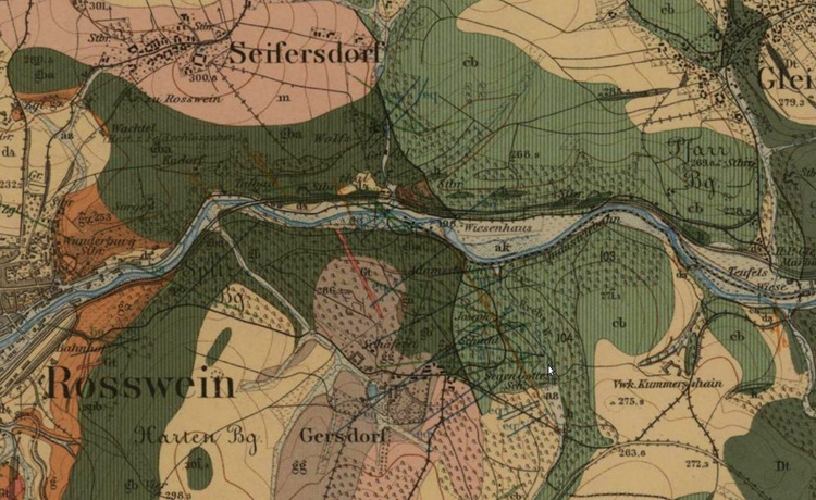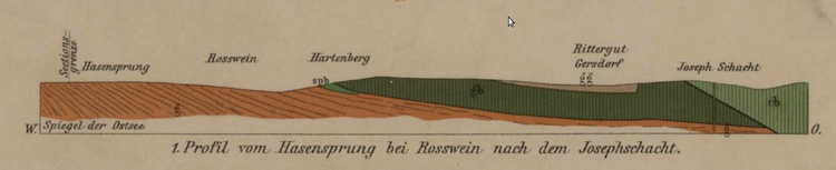 ![]() Schnittdarstellung aus dem geologischen Kartenblatt, sektion 63, revidiert 1906-1907 von E. Danzig und C. Gäbert. Bildquelle: Deutsche Fotothek, Kartenforum.