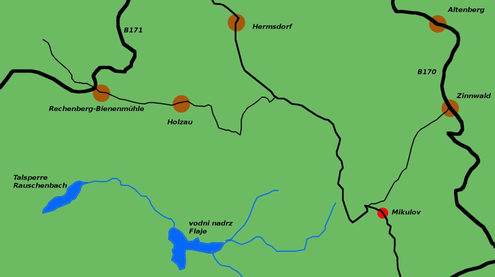 heute Für am historischen Bergbau interesssierte Besucher, wie auch für das Fachpublikum aus Sachsen und Böhmen ist der „Lehnschafter Stolln“ ein wahres Kleinod! Seit etwa 1987 wird diese Bergwerksanlage durch eine Fachgruppe der tschechischen Höhlenforscher - "Česká speleologická společnost” Grundorganisation 4-04 Agricola - betreut, aufgewältigt und auch für touristische Zwecke teilweise erschlossen. Eine Besonderheit ist, daß diese Bergwerksanlage aufgrund ihrer Lage vollständig wasserfrei und somit zumindest für wissenschaftliche Zwecke nahezu komplett fahrbar ist. Das Berggebäude wird durch 12 Sohlen auf 210 m Höhenmeter bergmännisch erschlossen. Die horizontalen Auffahrungen haben eine Gesamtausdehnung von über 12 km. Die Wasserlösung erfolgt noch immer über die tiefste Sohle, den Kreuzstolln, einem früheren Erbstolln speziell zur Entwässerung des Berggebäudes. Die Grubenanlage ist seit 1858 bergmännisch auflässig und wurde erst wieder um 1987 geöffnet. Die Fachgruppe erforschte und dokumentierte die Grubenanlage seit dieser Zeit und richtete auf der obersten Sohle, den Lehnschafter Stolln als Besucherbergwerk vor. Das Hauptaugenmerk lag dabei auf der ursprünglichen Erhaltung der Grubenbaue und Situationen sowie erforderlichen, umfangreichen bergmännischen Sicherungsarbeiten. Dabei unterscheidet sich diese Aufwältigung und Herstellung für touristische Zwecke sehr deutlich von „deutschen Normen“, ohne dabei Abstriche an der Sicherheit der Besucher wie auch der Betreiber zu bemerken. Die im Besucherbereich installierte Grubenbahn ist zwar unpassend, aber unabdingbar für die Aufwältigung des Berggebäudes und deren Instandhaltung. Die technische Umsetzung dieser Grubenbahn ist äußerst bemerkenswert und hoch innovativ, sowie auch für den Touristen sehenswert! Der Besucherbergwerksbereich unterscheidet sich somit erheblich von „deutschen Vorstellungen“ und sollte als Vorbild für alle ähnlich gelagerten Projekte und BBW im deutschen Raum angesehen werden. Dieses montanarchäologische Befahrerparadies stellt aber an Touristen wie auch den Bergbaufreunden gewisse Ansprüche. Es gibt insgesamt vier Befahrungsrouten. Davon sind die Routen A und B als touristisch erschlossen zu betrachten und können von fast jedem Interessenten auch befahren werden. Die Routen C und D sind dagegen äußerst anspruchsvoll und sollten nur mit einiger „Bergerfahrung“ befahren werden. Hierfür ist auch eine persönliche Ausrüstung wie Stiefel oder wasserfeste Kletterschuhe, passende Kleidung und eigenes Geleucht unbedingt zu empfehlen! Auf die Sicherheitsaspekte während einer solchen Befahrung muss selbst geachtet werden. Hier gelten die allgemeinen Regeln der Montanfoschung! Die unter dem Lehnschafter Stolln liegenden 11 Sohlen sollen fast alle fahrbar sein, allerdings kann der Sohlenwechsel nur unter Anwendung montanspeläologischer Techniken erfolgen. Diese Bereiche sind nur erkundet und nicht für die Nutzung als BBW erschlossen und bleiben wissenschaftlichen Disziplinen vorbehalten. Dennoch zählt diese in der oberen Sohle, dem Lehnschafter Stolln, für Touristen erschlossene Bergwerksanlage mit zu den sehenswertesten Grubenanlagen des Sächsisch-Böhmischen Erzgebirges... Zu erreichen ist Mikulov oder auch Niklasberg am besten von Freiberg aus, wie unsere Skizzen zeigen. Man fährt einfach die Staatsstraße S 184 von Freiberg über Weißenborn und Hermsdorf und deren Fortsetzung bis nach Mikulov. Dieser Bergort muss schon im 14. Jahrhundert oder sogar noch davor unter dem Namen „Schellenberg“ existiert haben. Der Name „St. Niklasberg“ tauchte erst nach dem 30jährigen Krieg auf und heute im Tschechischen heißt dieser Ort „Mikulov“. Er lebt heute von Sport und den deshalb hier anreisenden Touristen.