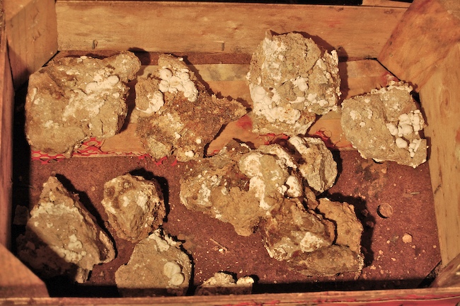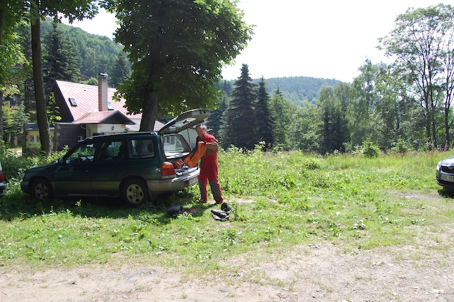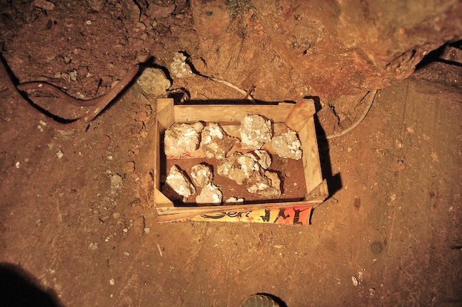 ![]() Hier gibt es die erste Stelle, wo man überhaupt Spuren von Erz sehen kann. Es handelt sich dabei um dasselbe Material wie an der Wäschestatt, nur Nebengestein mit äußerst wenig Arsenkies, aber völlig verdreckt. Für die Besucher hat Pavel wohl schon mal eine Kiste bereitgestellt. |