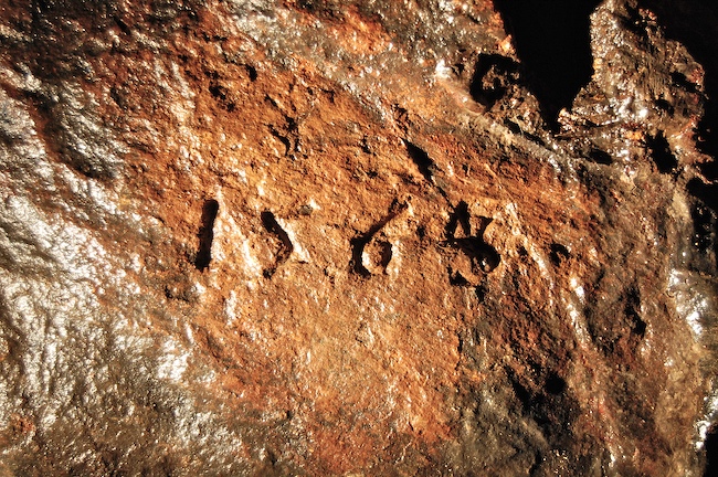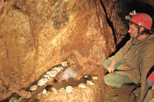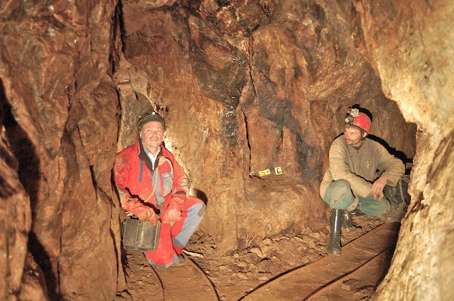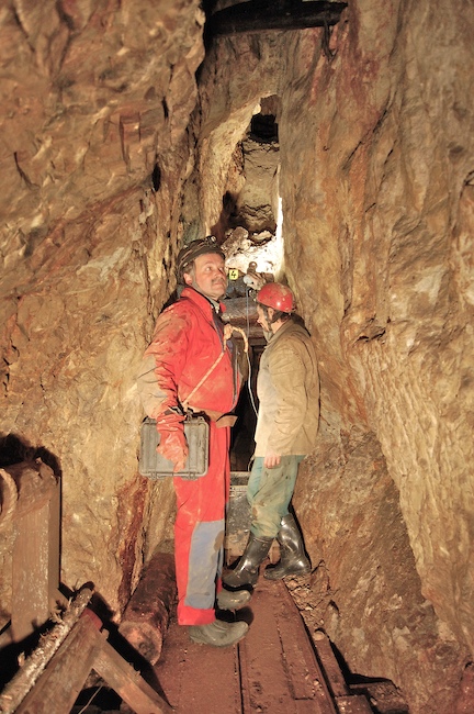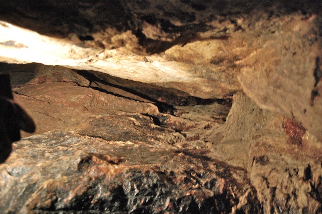 ![]() Die Strecke folgt der Gangstruktur, die am rechten Stoß im Bereich der Firste durch etwas Eisenoxid erkennbar ist – wenn auch nur schwer. |