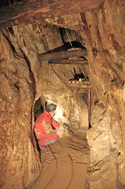 ![]() Die Grubenbahn geht von hier wieder zum Mundloch zurück und rechts geht es zu einem Abbau mit einer wohl einmaligen Einrichtung... |