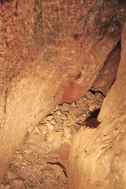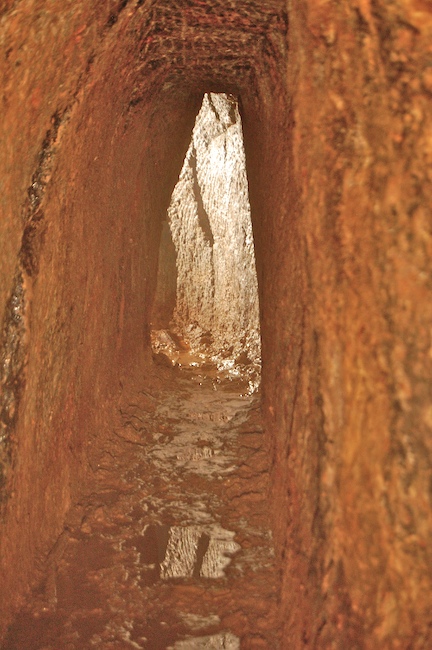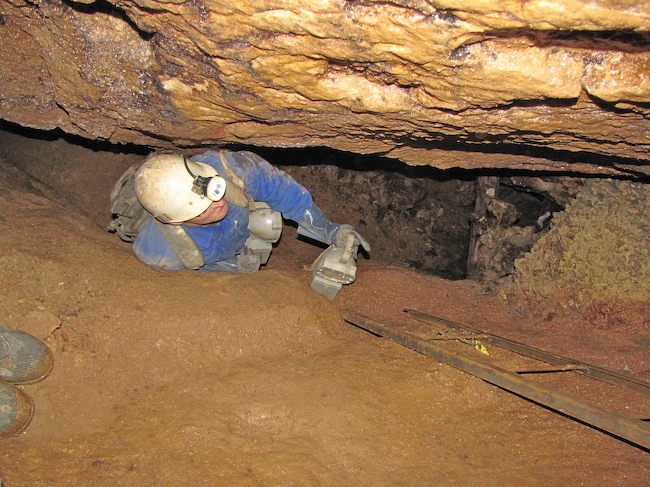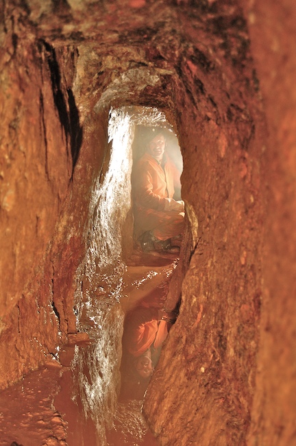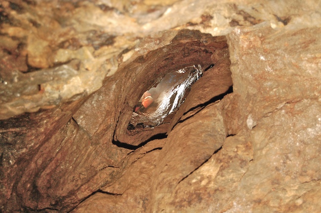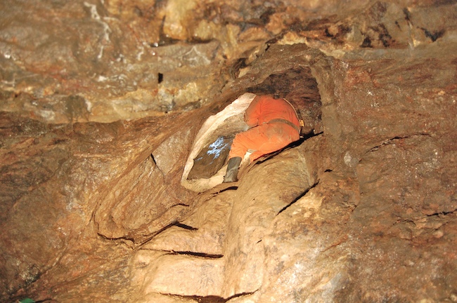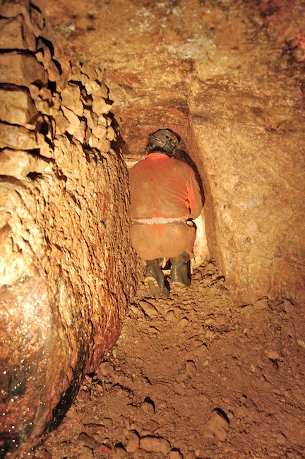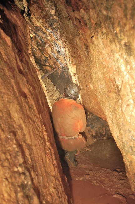 ![]() Wir begeben uns endgültig auf den Rückweg – wieder durch die engen Strecken und den teilweise verrollten Abbau bis zum großen Gangkreuz im Bereich der Touren A und B, wo unsere Befahrung auch begann. |
