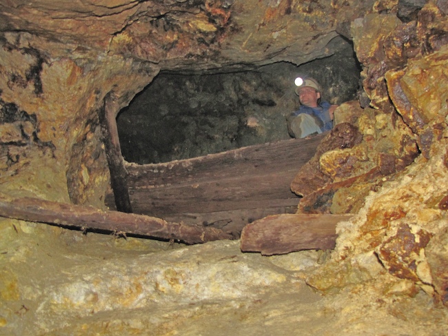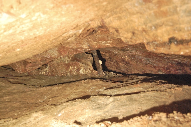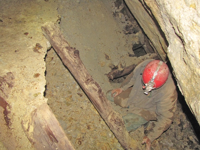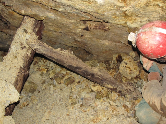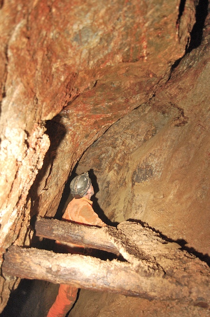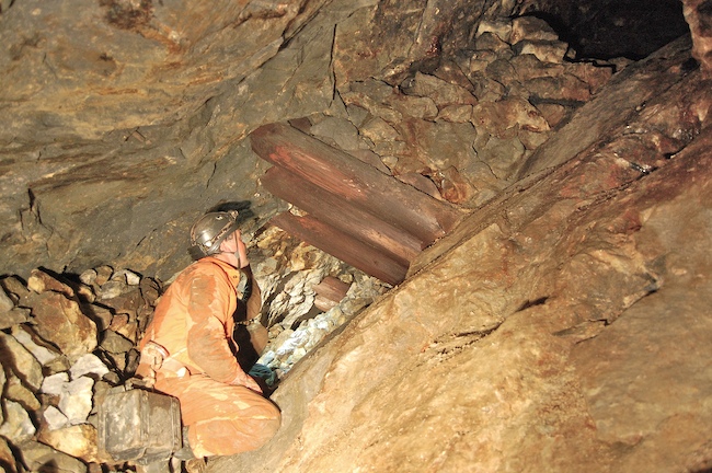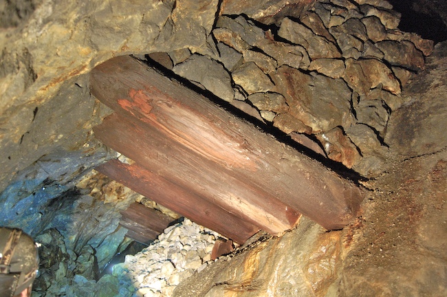 ![]() Man klettert auf den uralten, aber noch festen Hölzern herum, auch der Fotograf steht zusammen mit etlichen Zentner Versatz auf solchen alten Pfosten. |