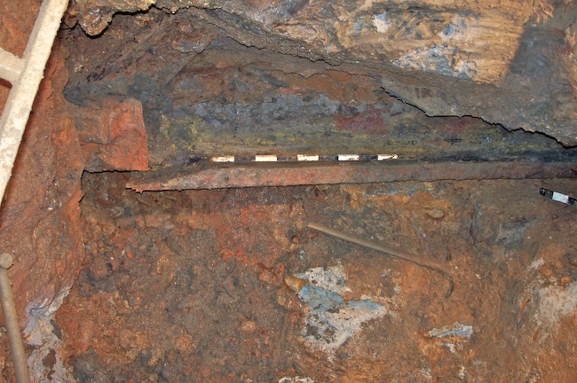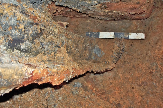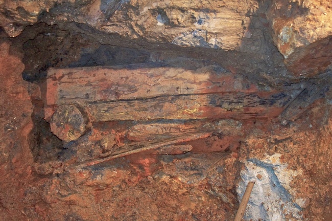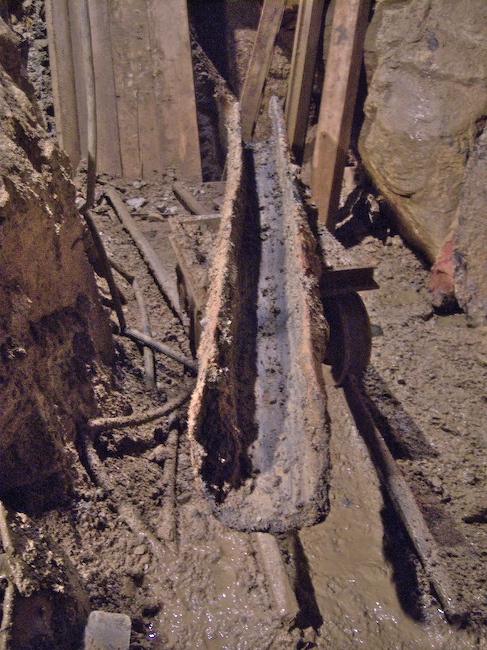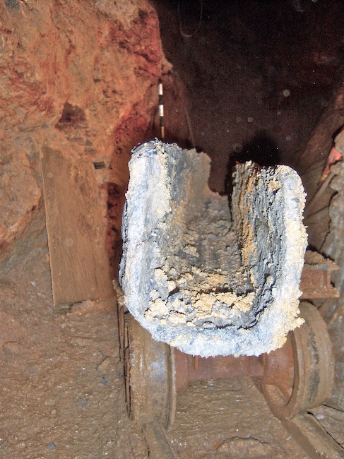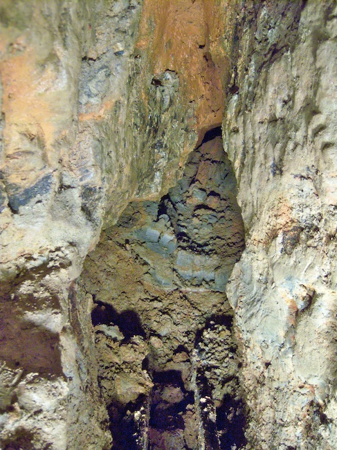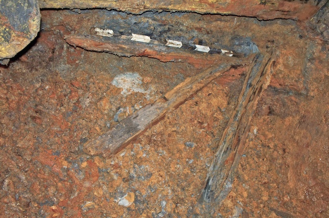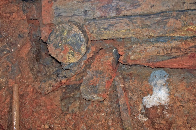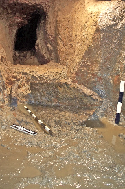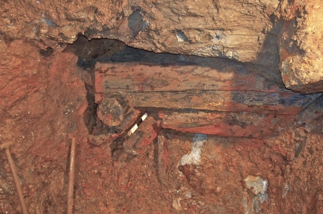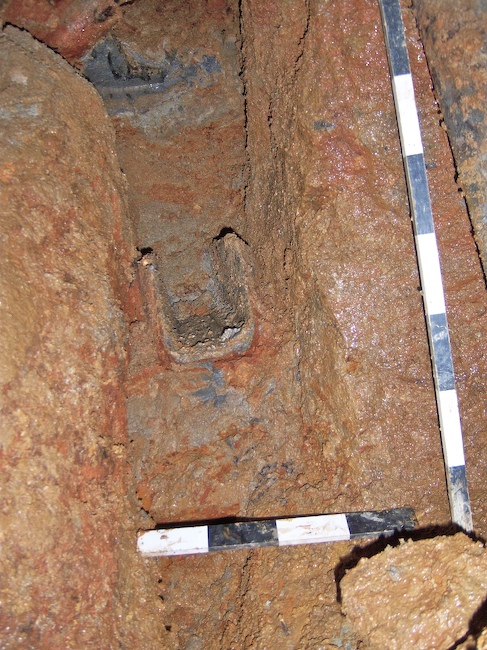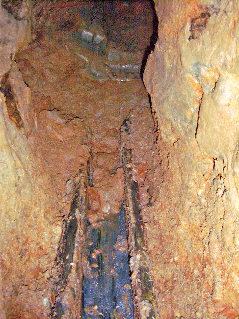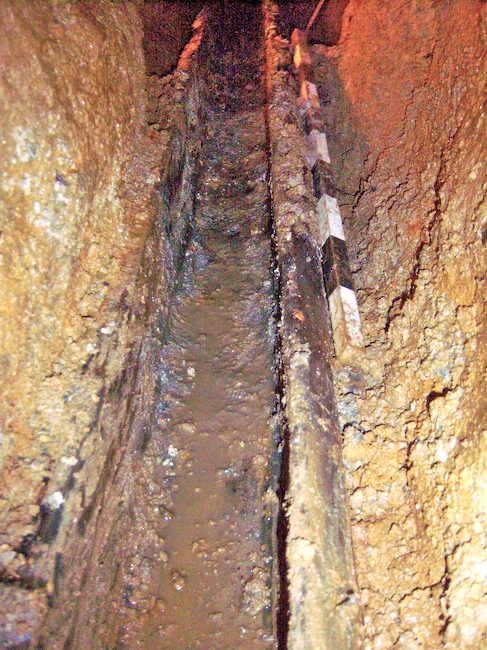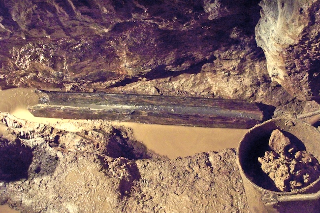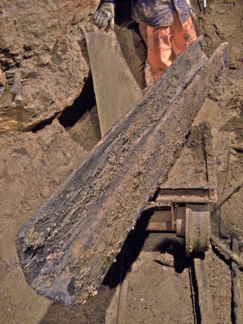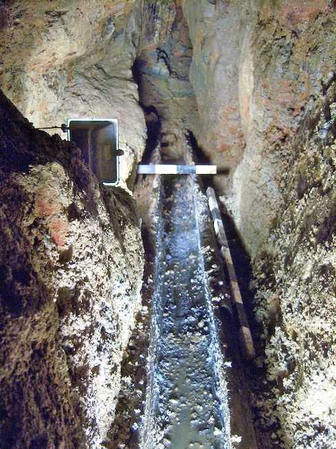 Rinne aus Untersuchungsschacht 8 Ebenfalls im Jahr 2010. Dabei handelt es sich um einen Einlauf aus einem Schacht in das umfangreiche Rinnensystem zur Entwässerung des Grubenkomplexes. Wie schon vorher erwähnt handelt es sich um ein Rinnensystem das von 1222/24 bis wenigstens 1273 in Nutzung war.