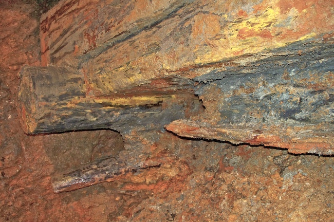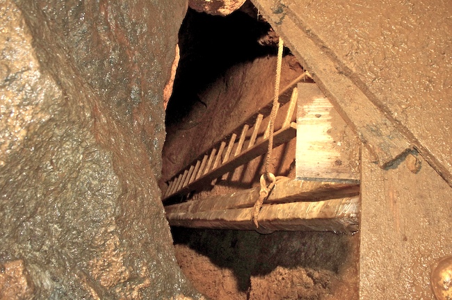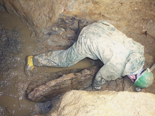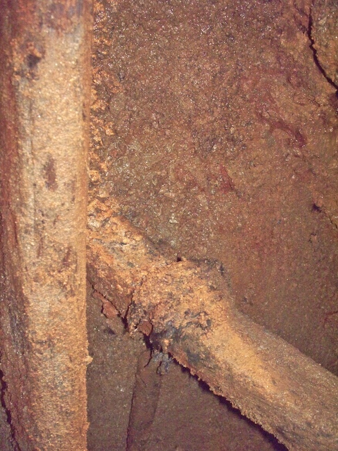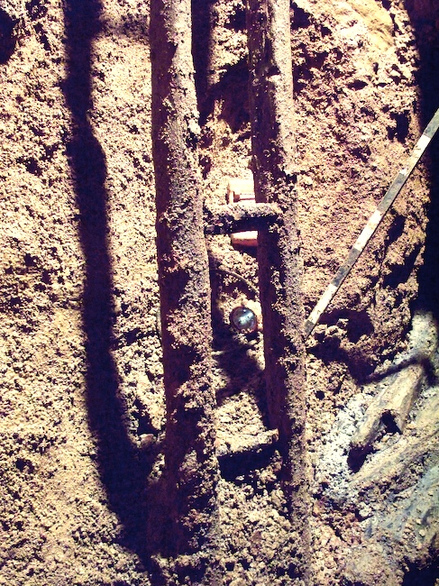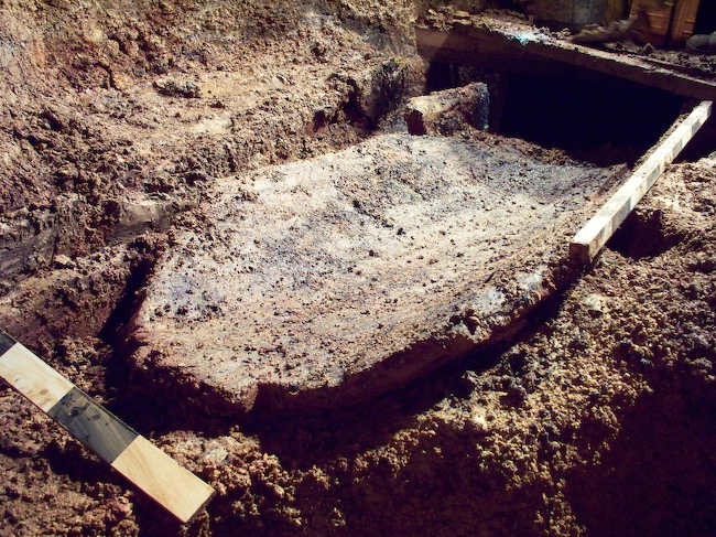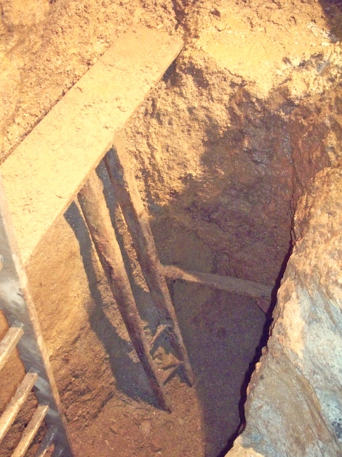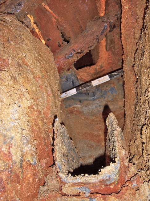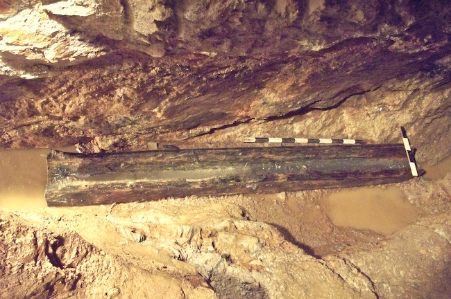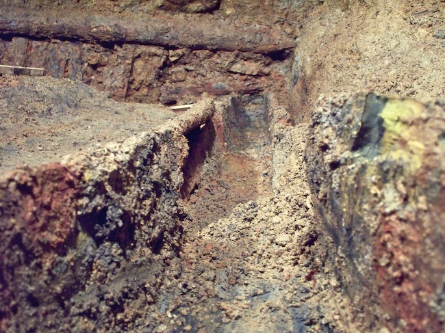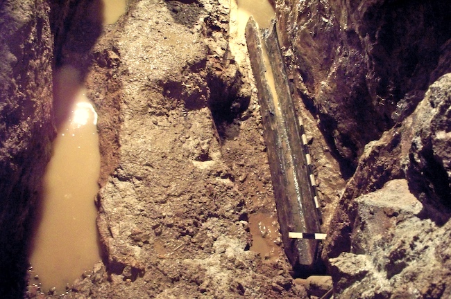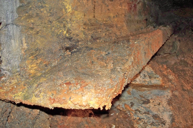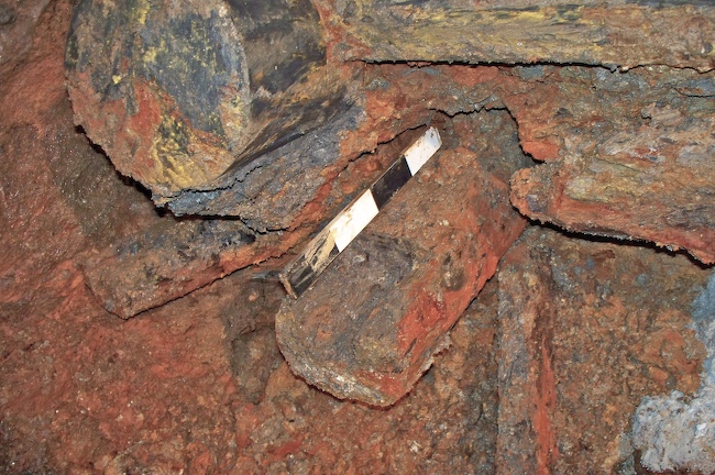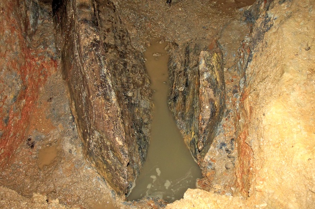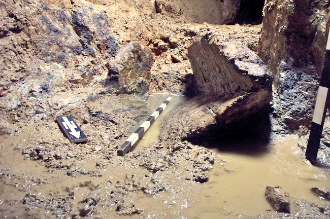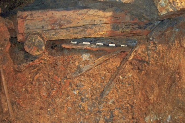 Rinne aus Untersuchungsschacht 8 Ebenfalls im Jahr 2010. Dabei handelt es sich um einen Einlauf aus einem Schacht in das umfangreiche Rinnensystem zur Entwässerung des Grubenkomplexes. Wie schon vorher erwähnt handelt es sich um ein Rinnensystem das von 1222/24 bis wenigstens 1273 in Nutzung war.