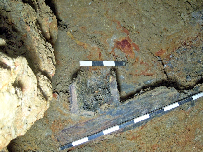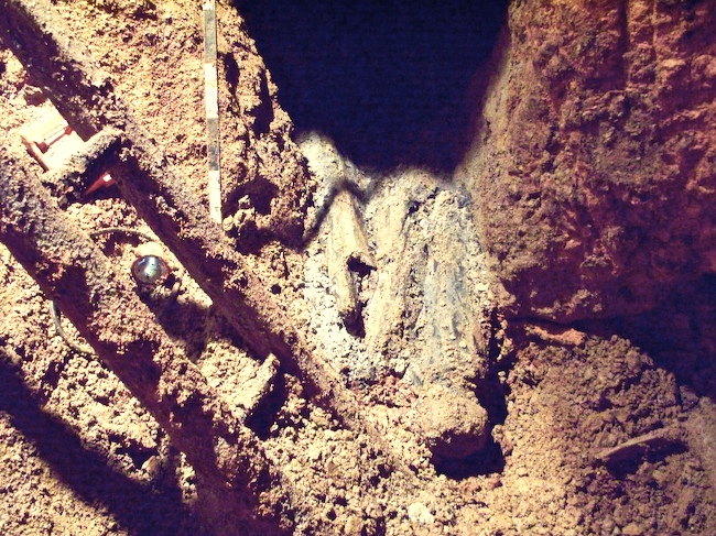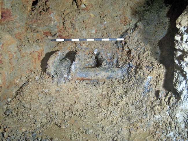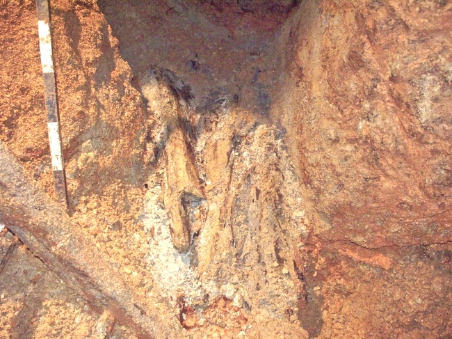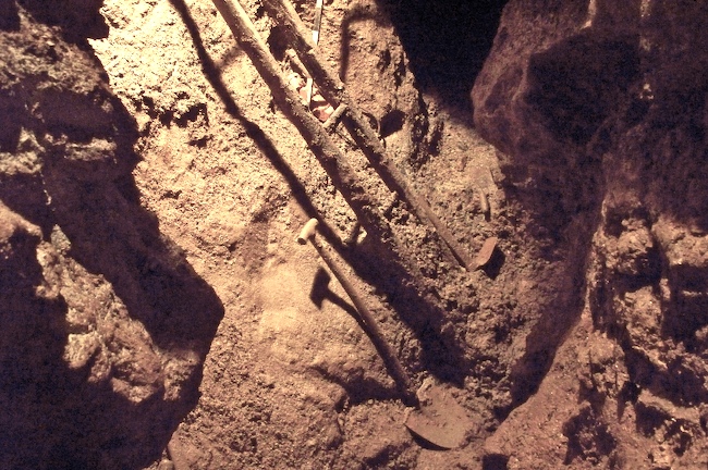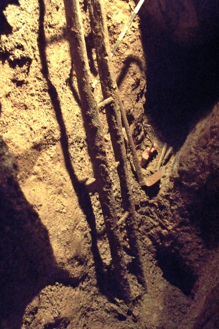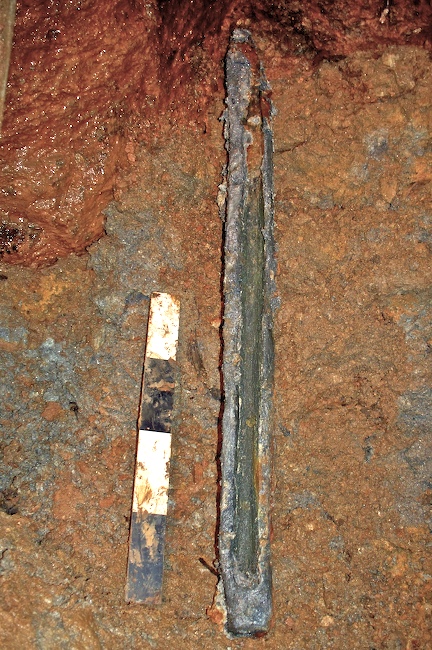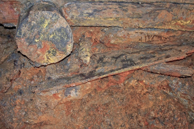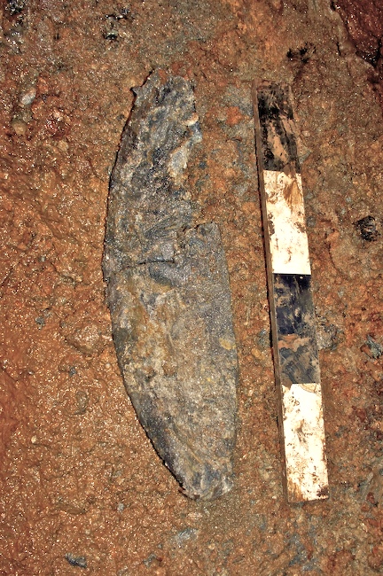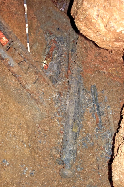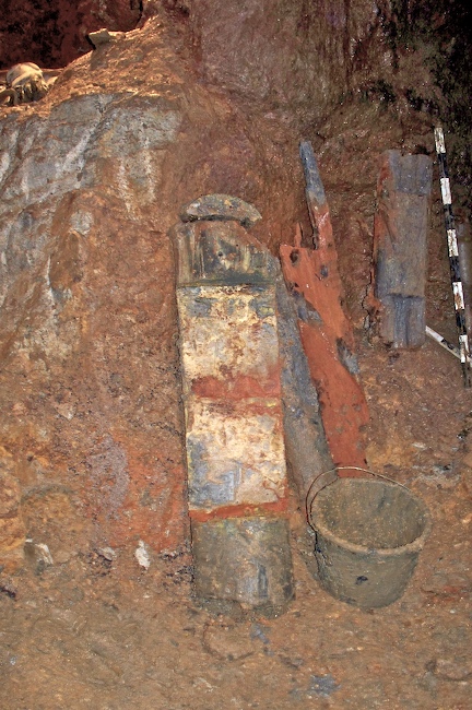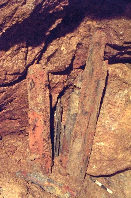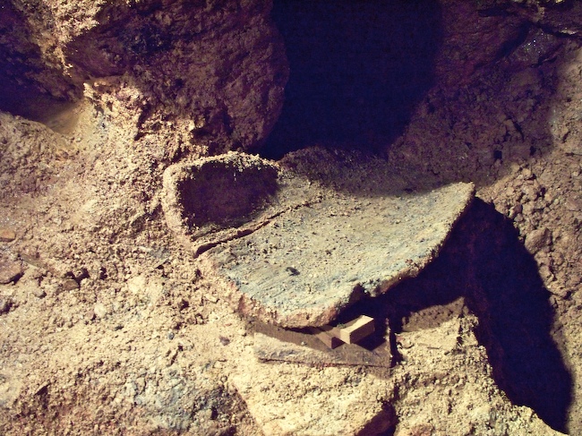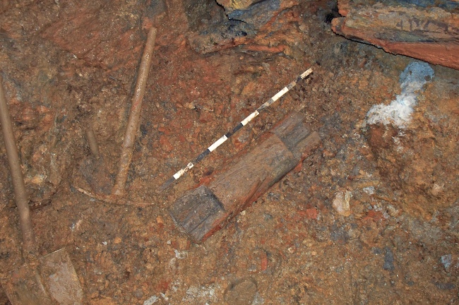 Nun wollen wir hier an dieser Stelle einmal eine kleine Auswahl an Funden oder Artefakten einem breiteren Publikum über das Medium „Internet“ vorstellen. Aufgefunden wurden sehr viele Artefakte nicht von den Archäologen, sondern von den dort tätigen Mitarbeitern des Freitaler Bergsicherungsbetriebes. Diese sind ja „vor Ort“ tätig und immer die Ersten, denen solche Funde vor die „Füße fallen“. Erst nach „telefonischer Alarmierung“ kommen dann die Archäologen, also die Fachleute für die Dokumentation, Bergung und Konservierung solcher Funde. Eigentlich entstehen erst ab diesem Zeitpunkt die Bilddokumente der Funde, die dann auch in den Publikationen zu finden sind. Doch es gibt auch noch andere Aufnahmen. Sämtliche Bilder der nachfolgenden Galerie wurden in erster Linie von Mitarbeitern des in Dipps tätigen Bergsicherungsbetriebes und nicht von den Archäologen erstellt und zeigen die Funde somit auch aus der Sicht des dort tätigen Bergmannes. Dies spiegelt sich besonders in der bildlichen Dokumention zum „Auffindezeitpunkt“ der jeweiligen Artefakte wieder! Die Bilder entstanden während der Zwangspausen – hervorgerufen eben durch diese Funde – in der eigentlichen Sanierungsarbeit und dies teilweise auch nur flüchtig und mit den gerade zur Verfügung stehenden Mitteln wie Halogenstrahler, LED-Kopflampe und handlicher Kompaktkamera, einfach um nur weiter arbeiten zu können. Alle nachstehenden Bilddokumente stammen von Thomas Witzke aus Glashütte, die er uns in dankenswerter Weise zur Verfügung gestellt hat. Ebenso auch die vielen kleinen Hintergrund- Details zu den einzelnen Funden. Sämtliche Bilddokumente beziehen sich auf den Untersuchungsschacht 8 und mit einer Ausnahme auf den Schacht 7 im Arbeitsgebiet rund um die Pension Göhler.