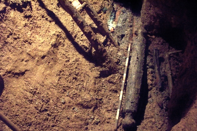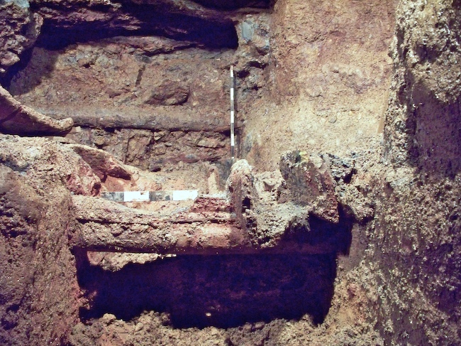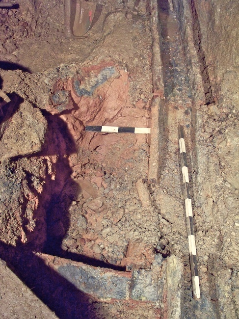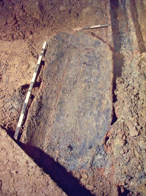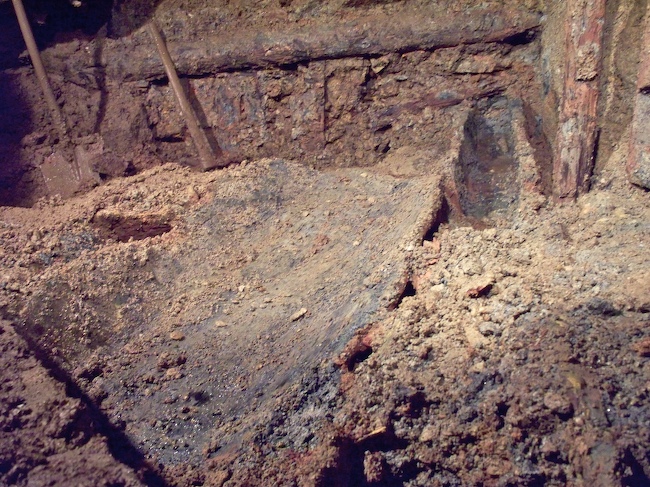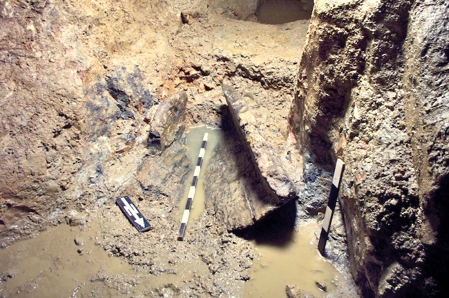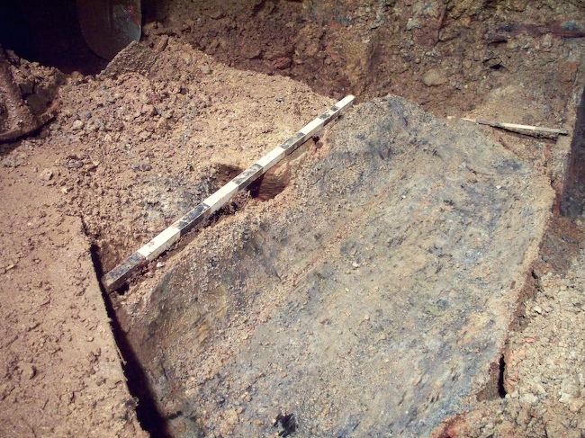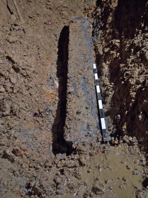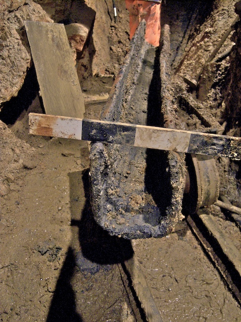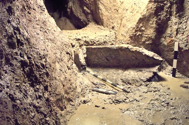Untersuchungsschacht 8 Ebenfalls Juni/Juli 2010, aber nördlich vom Schacht wurde ein weiteres Gerinne aufgefunden. Diese gehört aufgrund des Alters mit zum Komplex von Gerinnen aus der Zeit um 1222/24. Belegt wurde das Zeitfenster anhand zersägter Teile und eingebauter Grubenhölzer. Dabei sind aber auch weitaus ältere Hölzer aufgefunden worden und das gesamte Zeitfenster reicht bis 1180 zurück.