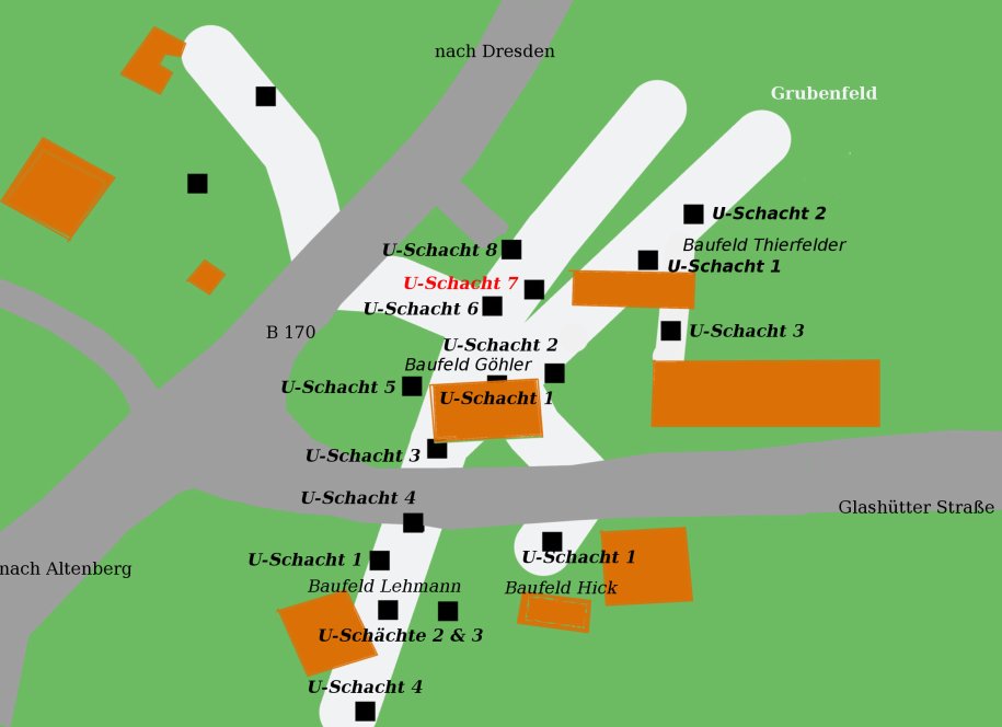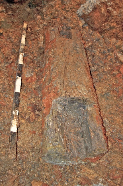 Untersuchungsschacht 8 Hierbei handelt es sich eigentlich um die erste südlich vom Schacht 8 aufgefundene Rinne im März 2010. Zeitlich wird dieser Fund dem Rinnensystem von 1222/24 zugerechnet. Am Fundort wurden aber noch drei Kappen festgestellt, die aus früherer Zeit stammten. Die älteste Kappe wurde in das Jahr 1186 datiert. Eine weitere Rinne mit Waldkante konnte dem Jahr 1211 zugeordnet werden. In einem weiter in die Tiefe führenden Schacht sind zwei Spreizen mit Waldkante geborgen worden und konnten dem Jahr 1190 zugeordnet werden. Daraus ergibt sich ein Zeitfenster, wonach dieser Grubenbau von wenigstens 1186 bis 1222/24, also wenigstens 40 Jahre bergbauliche Bedeutung hatte. Dies spiegelt sich besonders in der Streuung der dendrochronologisch ermittelten Jahreszahlen wieder und lässt auf eine gezielte „Instandhaltung“ dieses Grubenbaus schließen. Damit liegt auch ein Hinweis vor, der den Betrieb der tieferen Schächte noch in die Zeit vor Anlage des im Untersuchungsgebiet festgestellten Entwässerungssystems, also vor 1222/24 datiert.