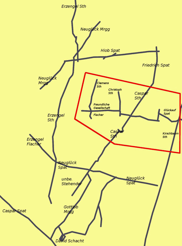 ![]() Das Gangkreuz von Caspar Stehendem, Glück auf Spat, Freundliche Gesellschaft Flachen, Benjamin Spat und Ernst Morgengang. Alle Gänge sind mit Gangtafeln und Jahrestafeln versehen.... |