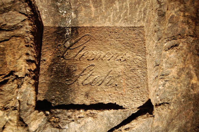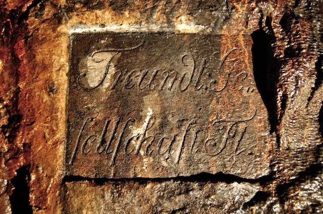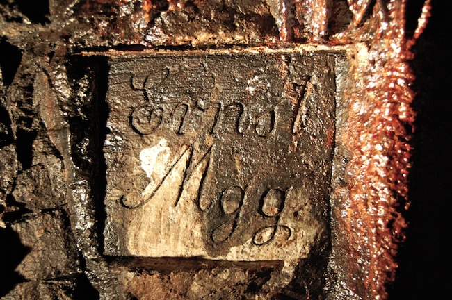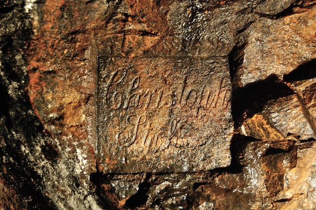 ![]() Die am „Glück auf Schacht“ im Bereich des Gangkreuzes mit dem „Freundliche Gesellschaft Flachen“ in den Gneis geschlägelte Gangtafel des „Clemens Stehenden“. |