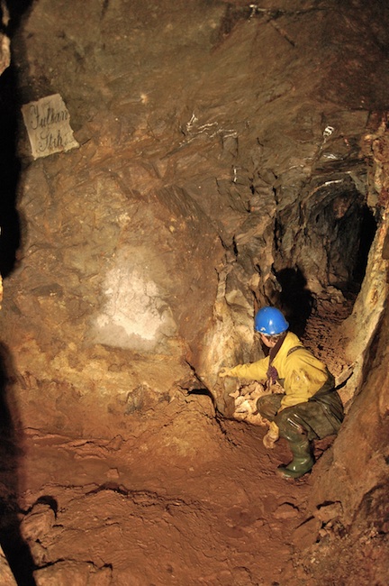 ![]() Ein leerer Abbau kündet von Erzfunden im Bereich des Gangkreuzes mit einem weiteren, aber unbenannten flachen Gang. Dieser streicht nahezu parallel mit dem „Freundliche Gesellschaft Flachen“. |