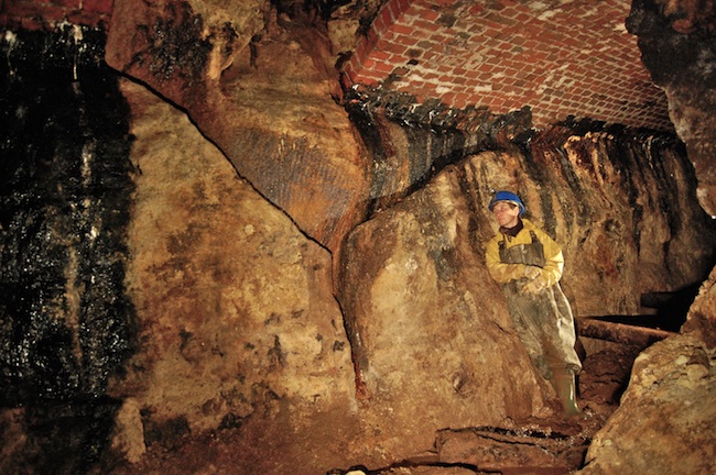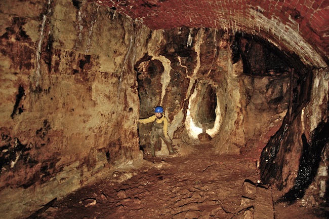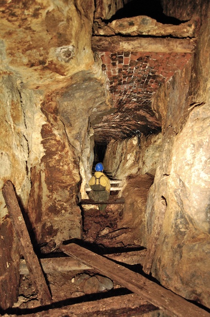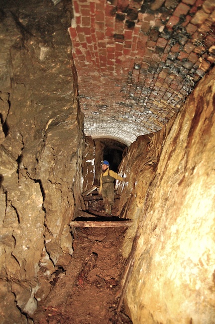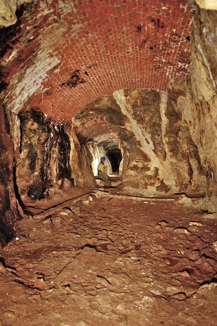![]() Gut sichtbar hier der leergezogene Abbau auf dem Gang. Die Grundstrecke ist mit einem flachen Ziegelgewölbe nach oben abgeschlossen... |