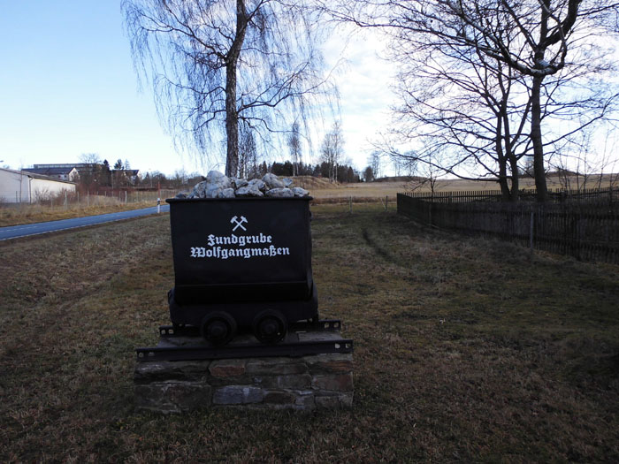 Geschichte 1555 bis 1736 Die Fundgrube wurde erstmals im Quartal Crucis des Jahres 1555 im Schneeberger Rezessbuch unter dem Namen St. Wolfgang Hagemüllers Lehn erwähnt. Benannt wurde sie nach dem Bergbauheiligen St. Wolfgang, der auch Namensgeber der spätgotischen Hallenkirche St. Wolfgang in Schneeberg war. Nach den Angaben im Rezessbuch muss man davon ausgehen, dass die Fundgrube schon im Quartal Trinitatis an Wolfgang Hagemüller verliehen wurde, da bereits eine Forderung nach Zubuße erwähnt wird. Neben der Fundgrube wurden im Jahr 1555 auch drei untere und sieben obere Maaßen genannt. In den folgenden Jahren wechseln sich Verleihung und wieder-in-das-Bergfreie-fallen der Fundgrube sowie der Maaßen ab. Ab 1563 war die Fundgrube zunächst ohne Unterbrechung in Betrieb. Im Jahr 1572 wurde das erste Silber gefunden und schon im selben Jahr 24 Gulden Ausbeute pro Kux gezahlt. Diese hohe Ausbeute diente sicherlich dazu, die Gewerken ruhig zu stimmen. In der Zeit von 1472 bis 1608 wurden am Ende nur 49 Gulden Ausbeute pro Kux gezahlt. Die nachgewiesene Silbermenge beträgt 490 kg, die wahrscheinliche Förderung liegt bei 650 kg Silber. Da die Maaßen extra abgerechnet wurden, muss man davon ausgehen, dass es wirtschaftlich selbständige Gruben waren. Zur Fundgrube gehörte offensichtlich die nächste Obere Maaß. Die Obere 2. Maaß brachte von 1572 bis 1602 526 kg Silber und eine Ausbeute von 74 Gulden pro Kux. Auch hier liegt die wahrscheinlich geförderte Menge Silber höher und beträgt ca. 720 kg. Die Obere 3. Maaß lieferte von 1576 bis 1597 264 kg Silber und eine Ausbeute von 18 Gulden pro Kux. Die wahrscheinliche Silberförderung beträgt hier ca. 320 kg. Die Obere 4. Maaß brachte von 1590 bis 1595 21 kg Silber und wurde 1595 mit der Oberen 5. und 6. Maaß vereinigt. Die Obere 5. Maaß lieferte 1475 das erste Mal Silber und wurde 1488 mit der Obere 6. Maaß vereinigt. Gemeinsam lieferten sie bis 1595 11 kg Silber. Die Unteren Maaßen lieferten kein Silber. Im Jahr 1608 förderten die Gruben auf dem Wolfgang Spat für lange Zeit letztmals Silber. Bedingt durch die Lage der Fundgrube im Tal des Riesengrundes gab es von Anfang an Probleme mit der Wasserhaltung. Abhilfe schufen hier ins Grubengebäude eingebrachte Entwässerungsstolln. Im Jahr 1574 erreichte der Griefner Stolln dessen Mundloch in einer saigeren Teufe von 36 m und im Jahr 1590 der obere, am Rappoltschacht verstufte Fürstenstolln mit einer saigeren Teufe von 118 m das Grubengebäude. Besonders das Einbringen des Fürstenstollns hatte ein steigendes Silberausbringen zur Folge. Allein in den Jahren 1591/92 wurden 360 kg Silber gefördert. Ab dem Jahr 1595 wurden die neun oberen Maaßen zusammengeschlossen. Die gewinnbaren Silbervorkommen waren weitestgehend abgebaut. In der Zeit von 1572 bis 1608 wurden, belegt durch Ausbeutescheine, mindestens 1312 kg Silber ausgebracht, die tatsächliche Menge dürfte bei 1722 kg Silber liegen. Nach dem Verkauf von Wolfgang Maaßen im Jahr 1609 begann der gezielte Kobaltabbau. Für die Jahre 1620 bis 1624 ist die Förderung von Kobalt auf der Fundgrube und den oberen Maaßen nachgewiesen. So werden auf der Fundgrube von 1620 – 1624 119 Kübel Kobalt gefördert. Die Obere 5. Und 6. Maaß fördert im Zeitraum 1623/24 204 Kübel Kobalt. Im Jahr 1632 wird nur noch von der Fundgrube nebst nächst Obere Maaß sowie von der oberen 2. bis 6. Maaß als Gruben berichtet. Es ist anzunehmen, dass die unteren drei Maaßen sowie die Obere 8. und 9. Maaß ins Bergfreie gefallen sind. Die zwischenzeitlich auch wieder ins Bergfreie gefallene Fundgrube wurde 1646 durch die Familie Schildbach wieder aufgenommen. Durch den 1641 abgeschlossenen Kobaltkontrakt lohnte sich die Förderung dieser Erze wieder. Im Jahr 1650 liefert die Fundgrube erstmals wieder Kobalt. In der Zeit von 1650 bis 1658 wird von der Fundgrube und Maaßen gesprochen. In dieser Zeit werden 110 Tonnen Kobalterz gefördert. Die Ausbeute beträgt Von 1660 bis 1686 gibt es nur eine Kobaltförderung der Maaßenschächte in Höhe von 24 Tonnen. Die Fundgrube wird nicht erwähnt. Durch den Verbruch bzw. die mangelnde Funktionsfähigkeit des Fürstenstollns war man allerdings nicht in der Lage, den Abbau weiter in die Tiefe zu bringen. Der Bergbau wurde deshalb im Jahr 1688 auf viele Jahre eingestellt.