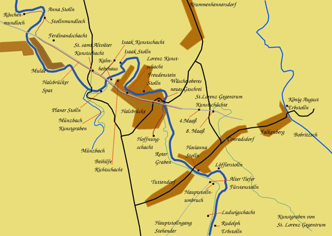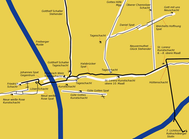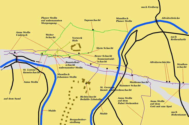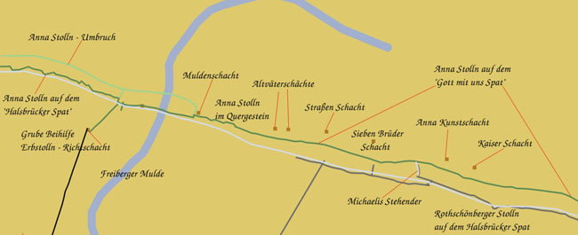 ![]() Verlauf des „Anna Stolln“ im Bereich des sogenannten Muldenbogens. Hier ist auch noch der Verlauf des „Planer Stolln“ ersichtlich. |
