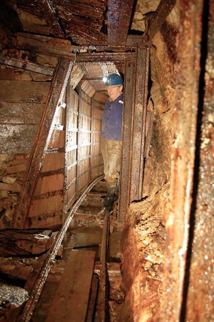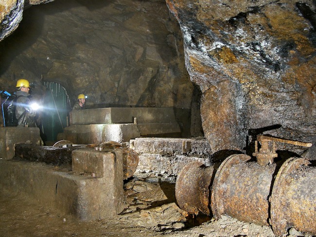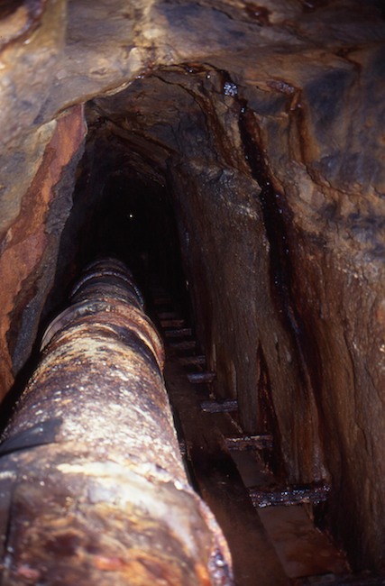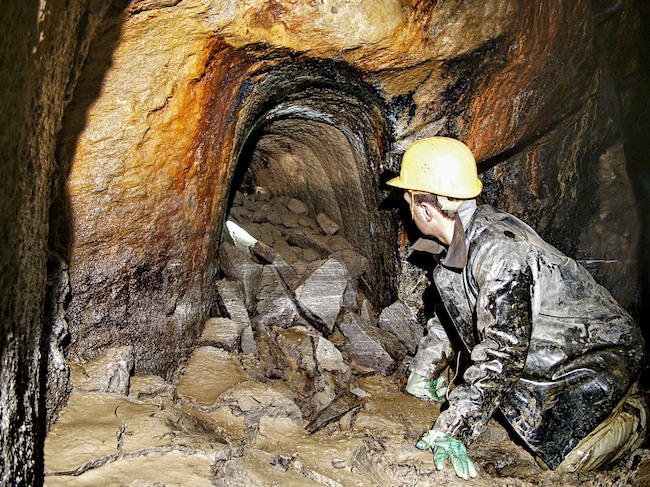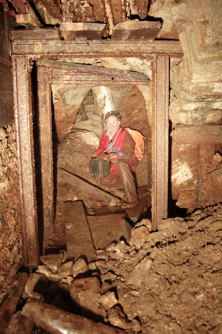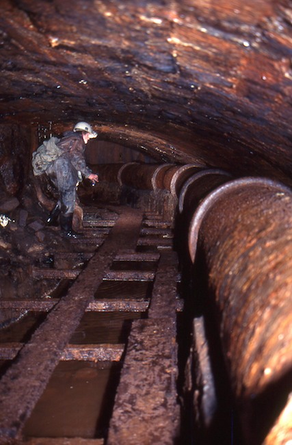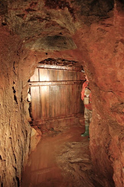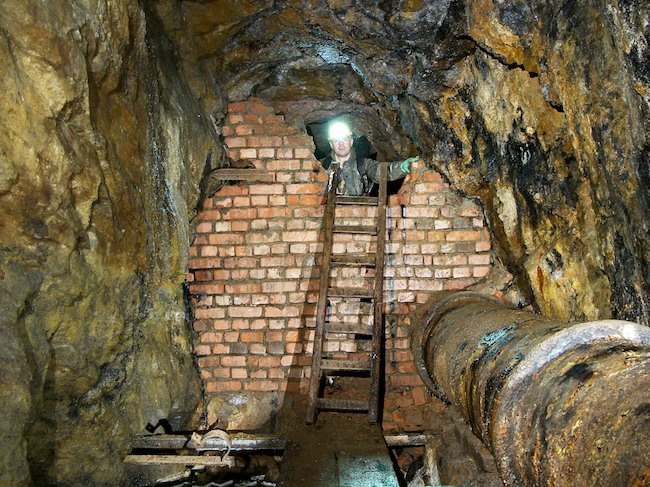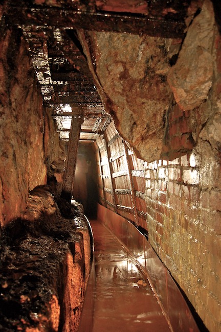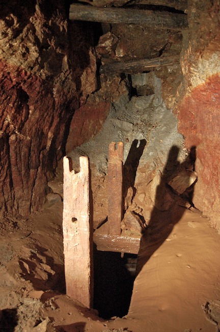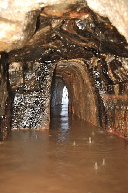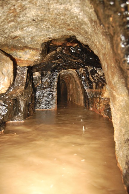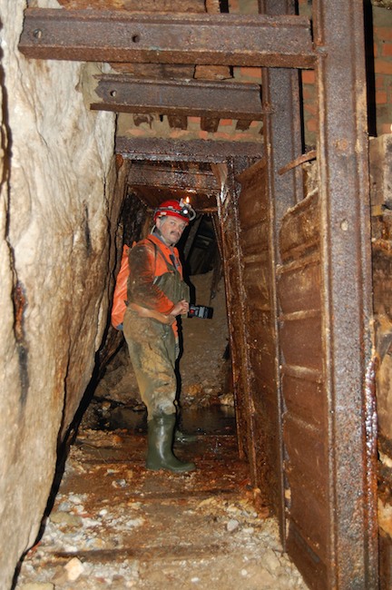 ![]() Der „Anna Stolln Umbruch“ ist mittels der Bohr- und Schießarbeit hergestellt und mit Tragwerk versehen, welches größtenteils intakt, aber von Schlamm überdeckt ist. |