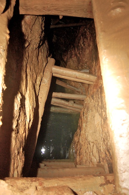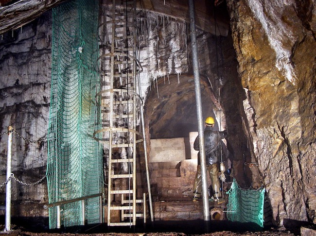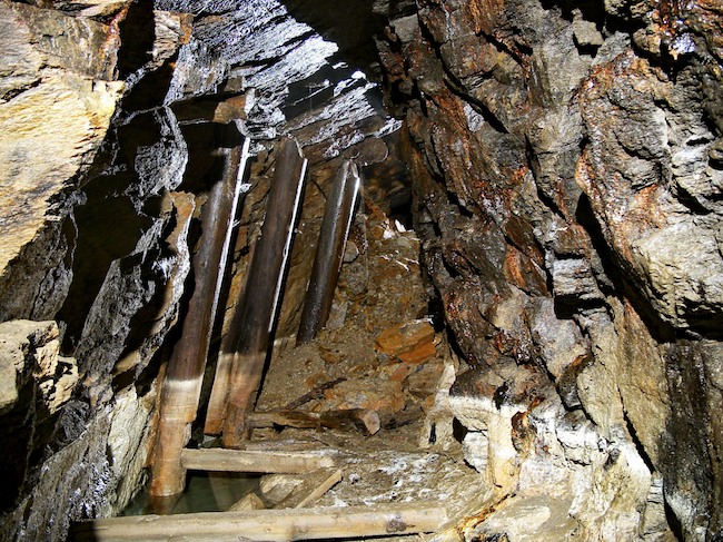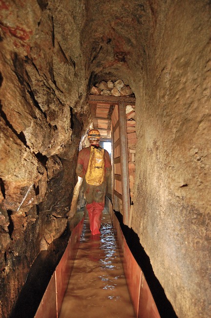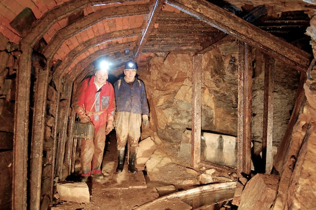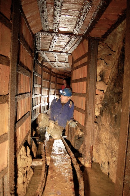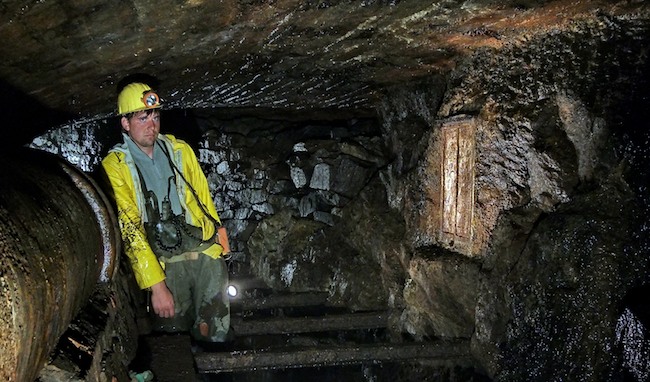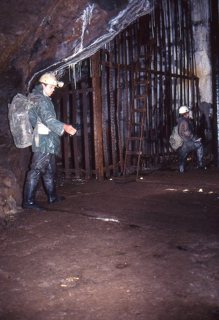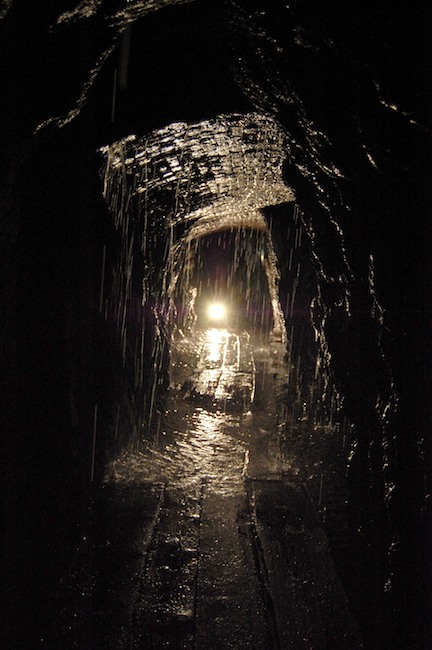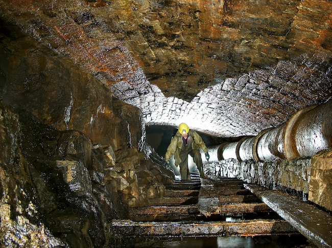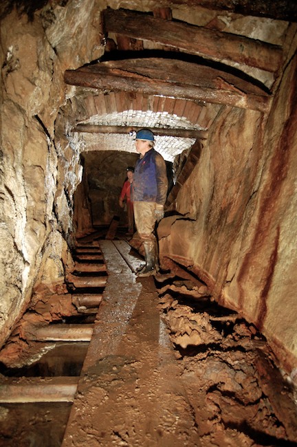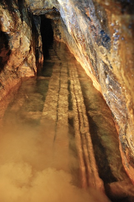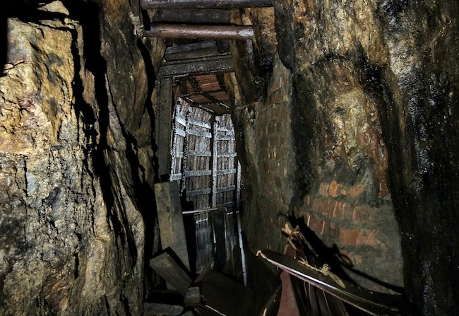 ![]() Der „Anna Stolln Umbruch“ ist mittels der Bohr- und Schießarbeit hergestellt und mit Tragwerk versehen, welches größtenteils intakt, aber von Schlamm überdeckt ist. |