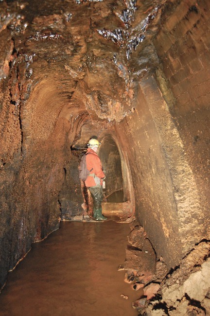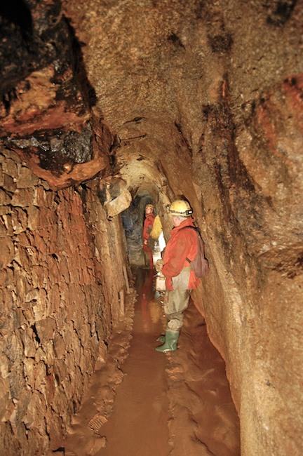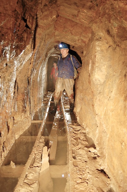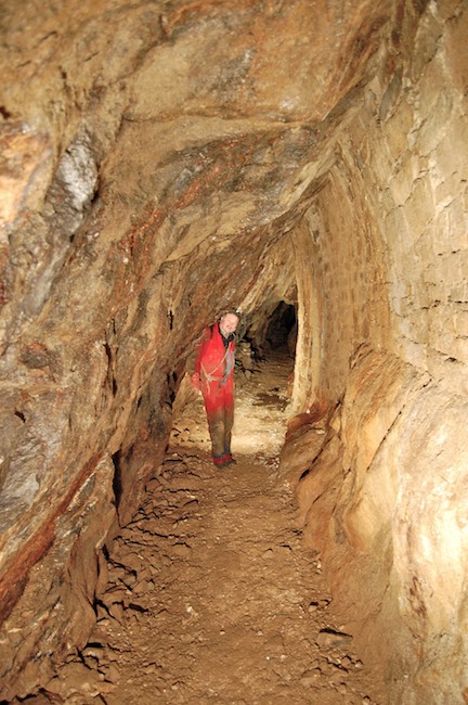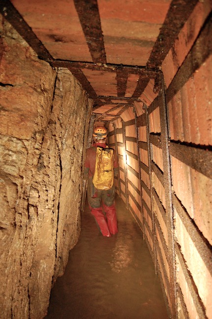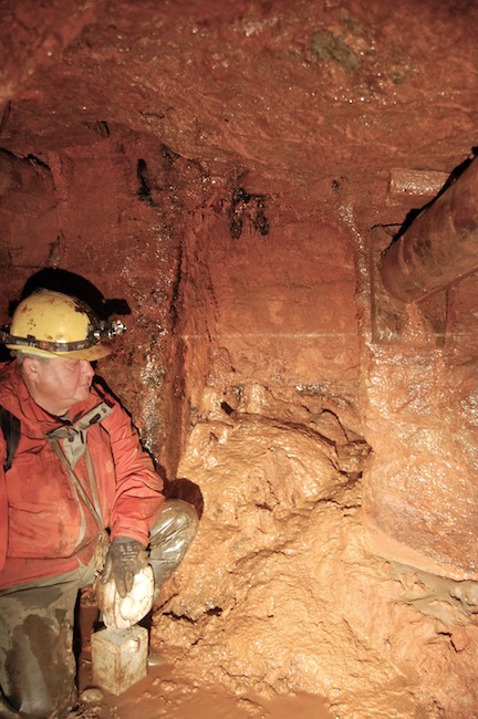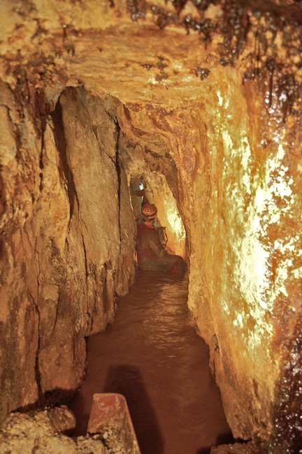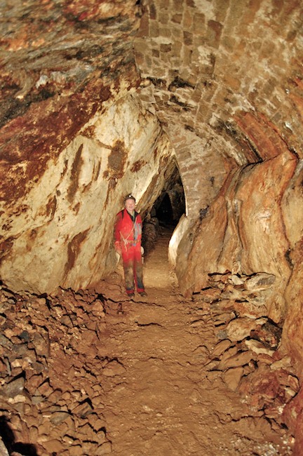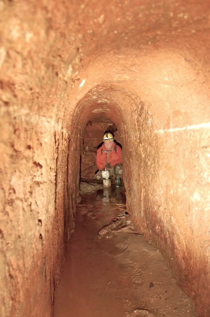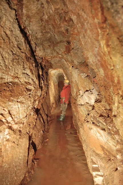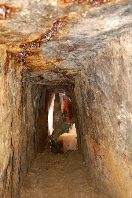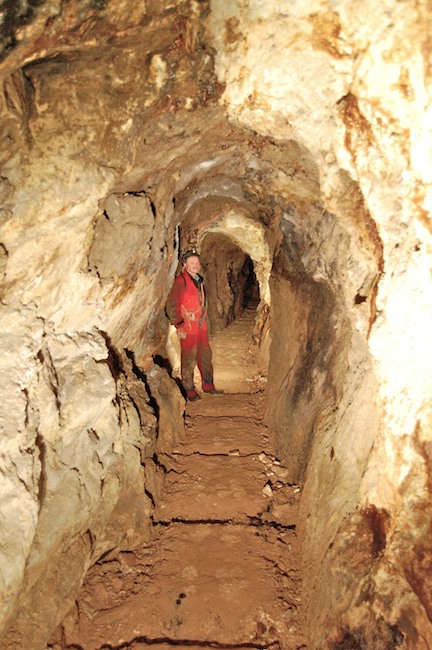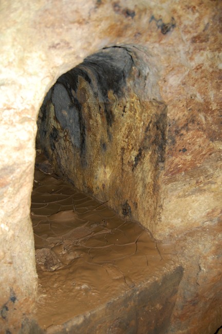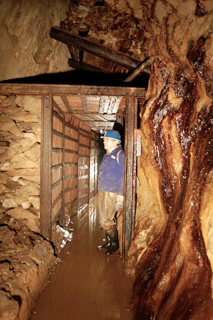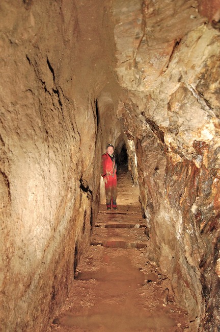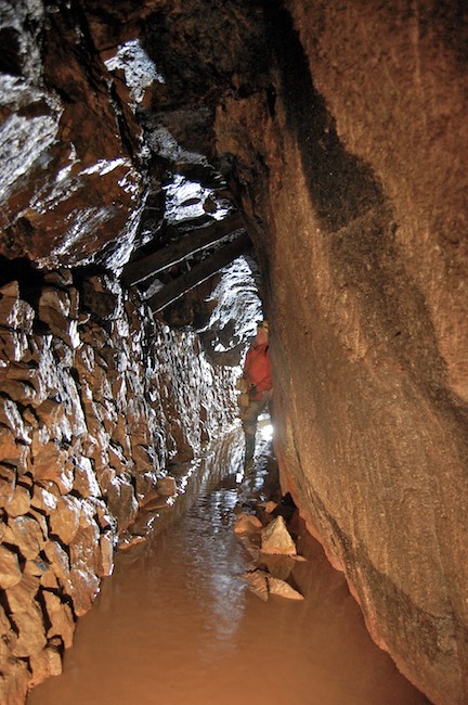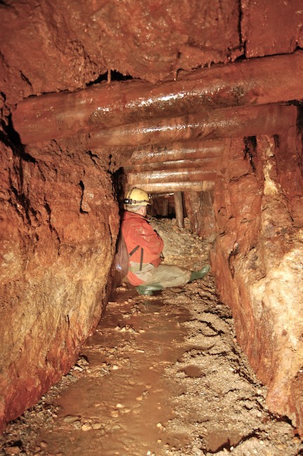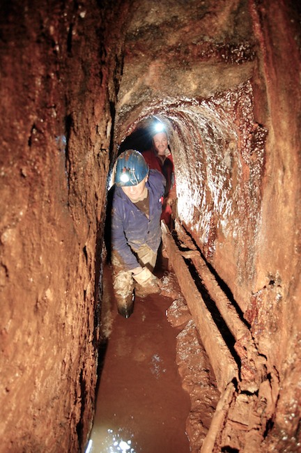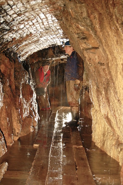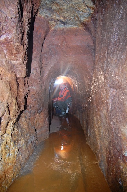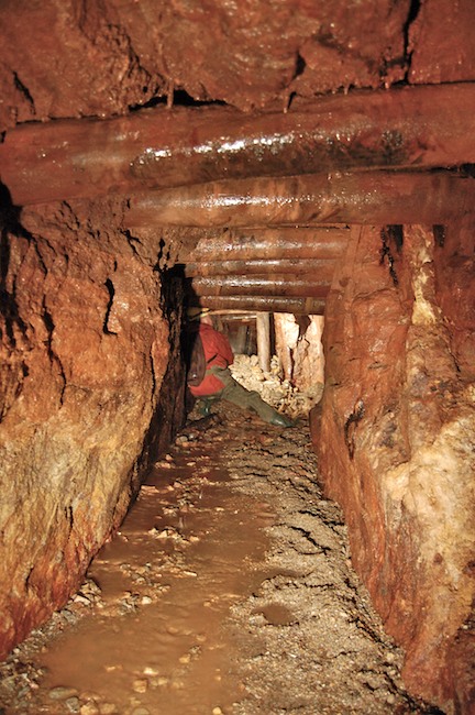 ![]() Der gesamte Stolln ist hier nahezu mannshoch mittels Schlägel und Eisen hergestellt und beherbergt zähen eisenhaltigen Schlamm, der immer höher wurde. |
