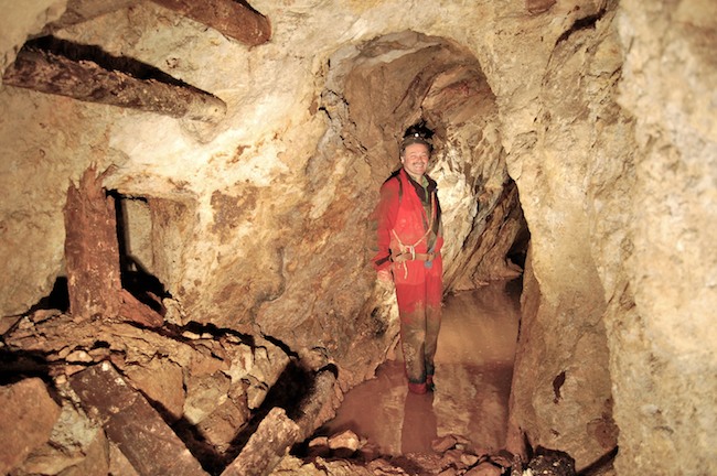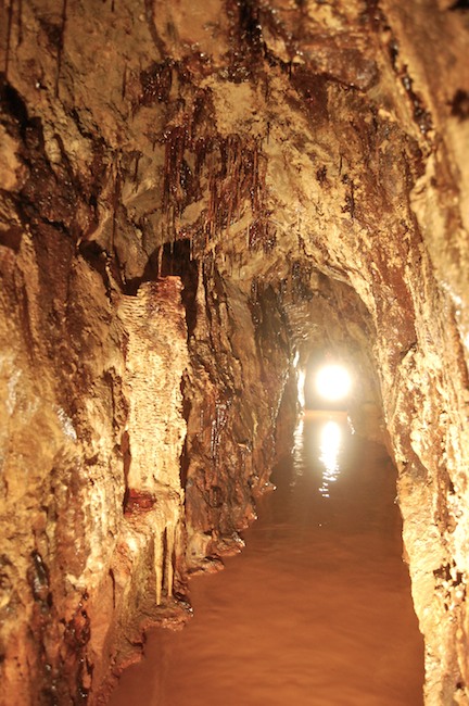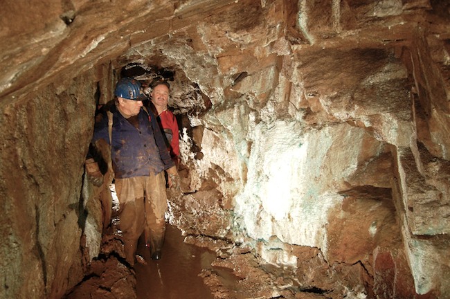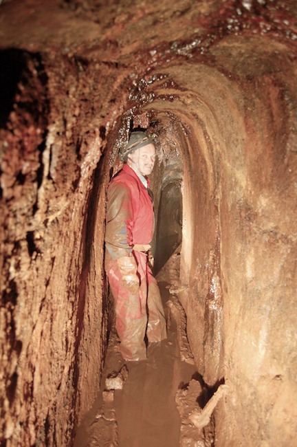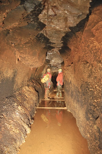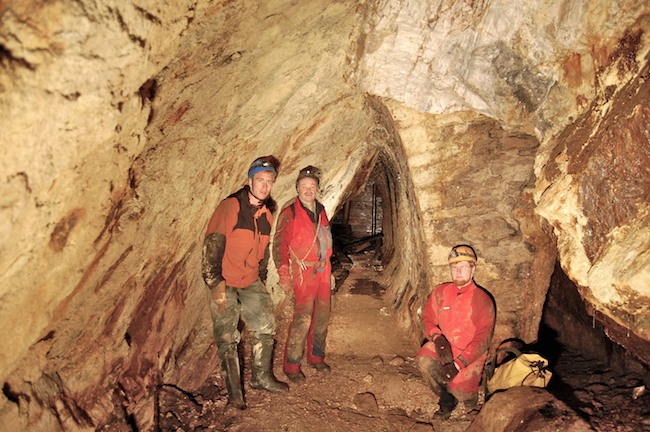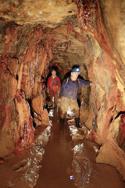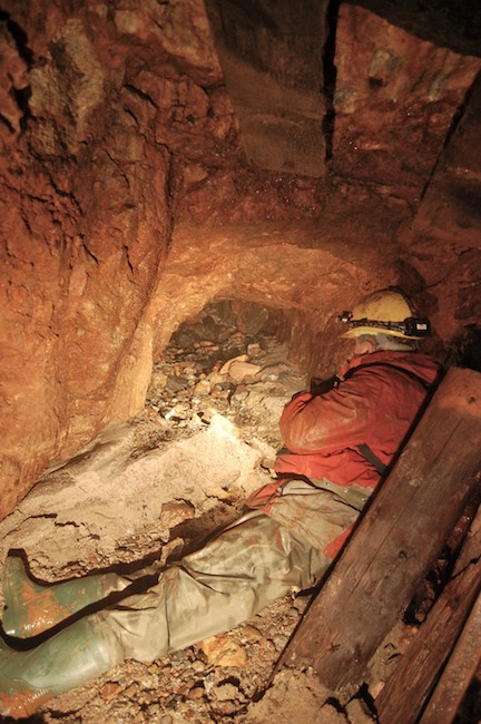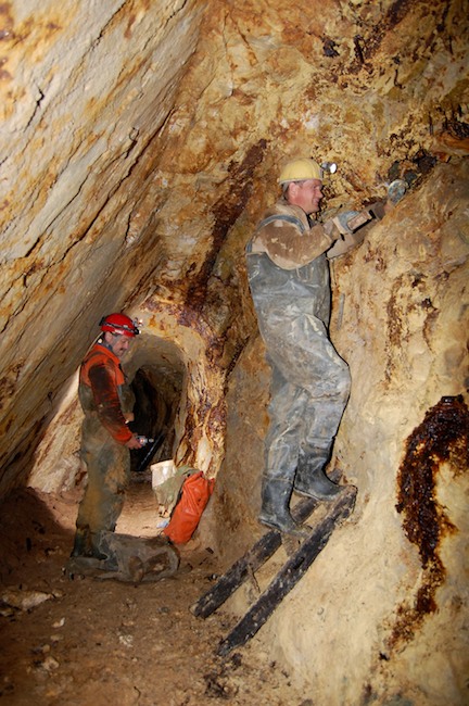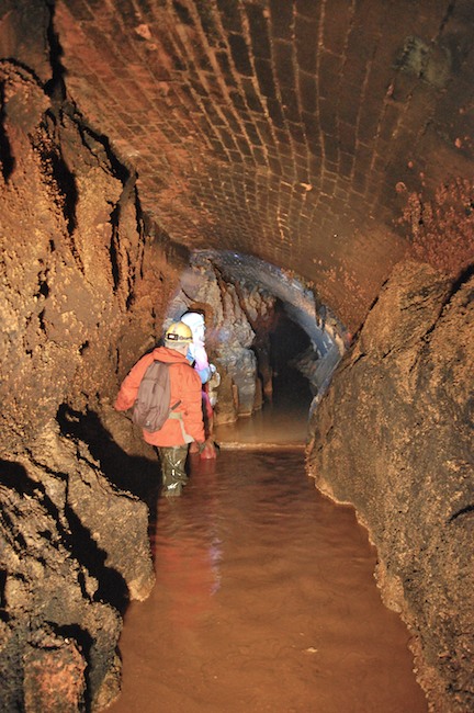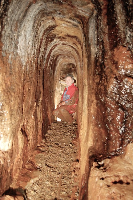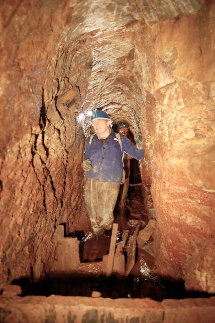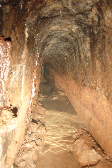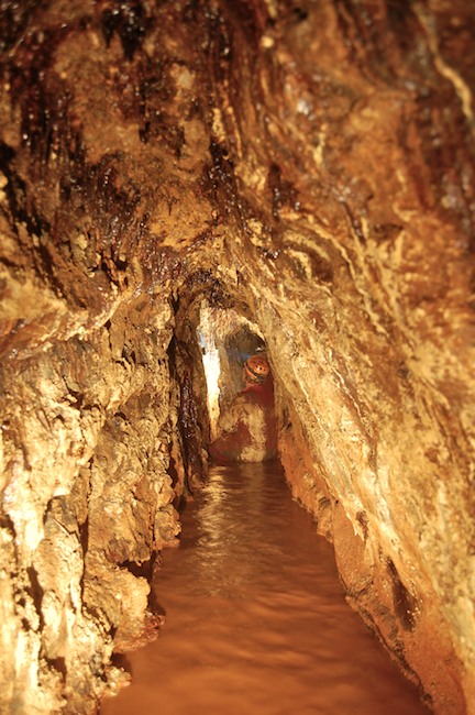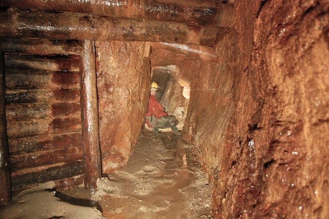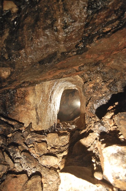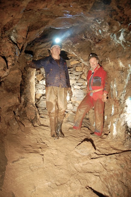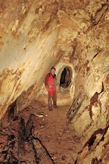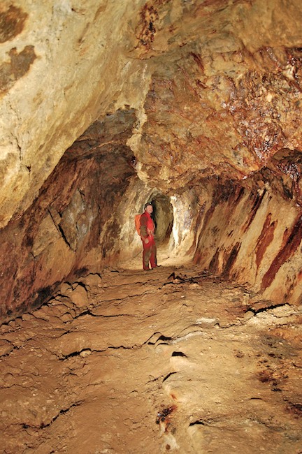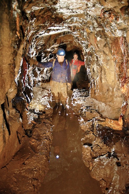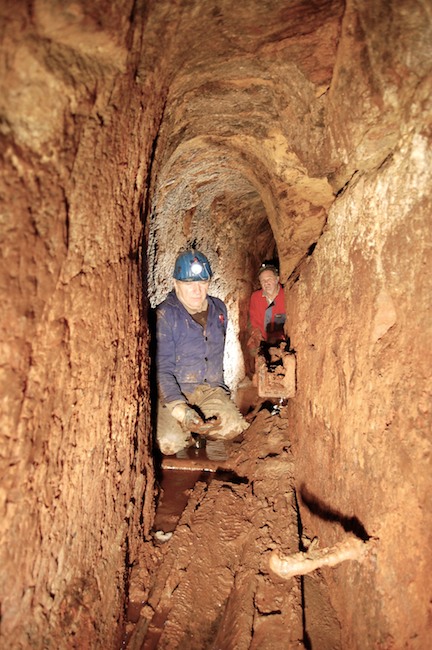 ![]() Der gesamte Stolln ist hier nahezu mannshoch mittels Schlägel und Eisen hergestellt und beherbergt zähen eisenhaltigen Schlamm, der immer höher wurde. |