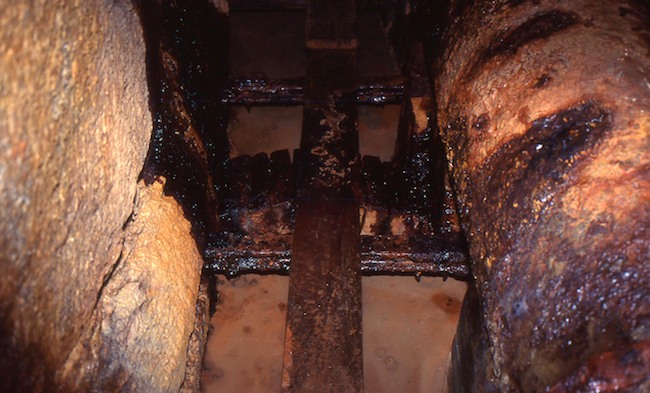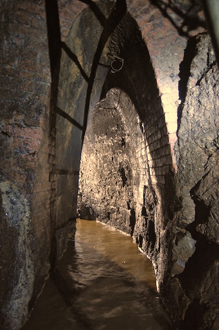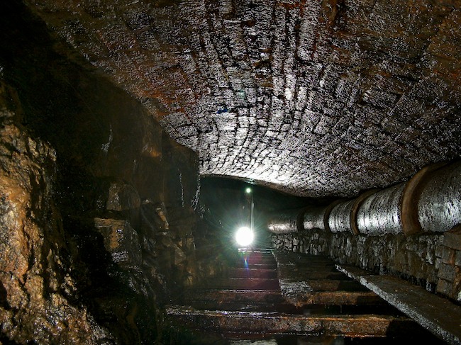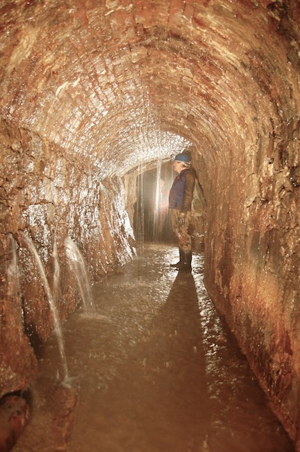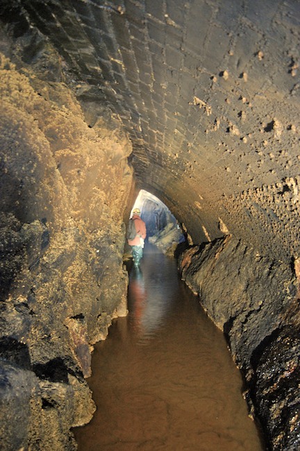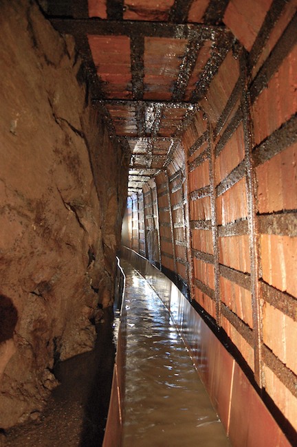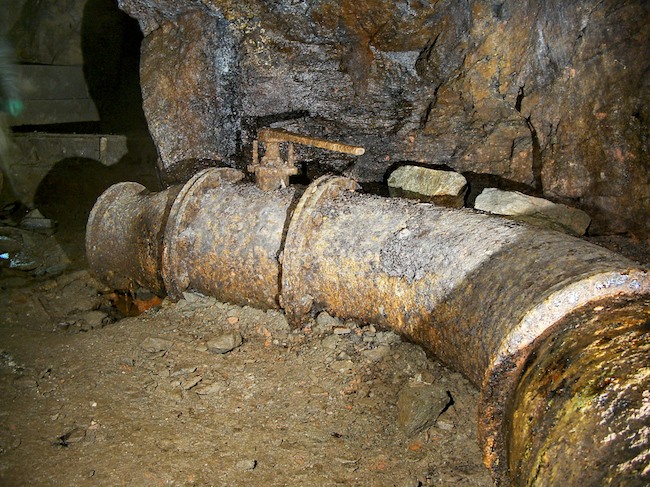 ![]() Imposant ist die gewaltige Druckleitung für die Wassersäulenmaschine unter dem nur flach gewölbten Bruchsteingewölbe. |