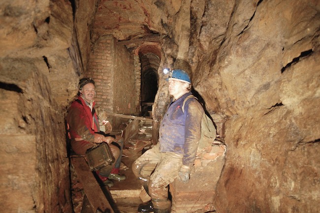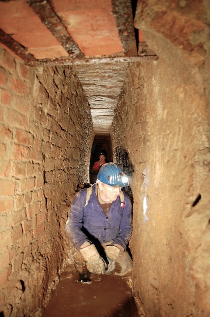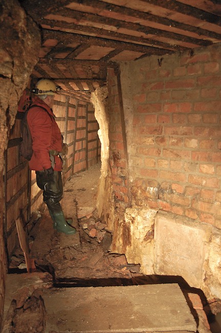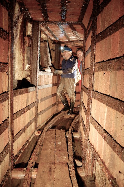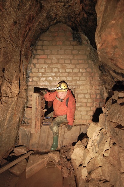 ![]() Auf dem Umbruch ist noch eine Gewölbelehre am originalen Platz erhalten. Hier kann man sehr schön nachvollziehen, wie unsere „Alten“ die von uns überall bestaunten Bruchstein- und Ziegelgewölbe in die Gruben eingebaut haben. |