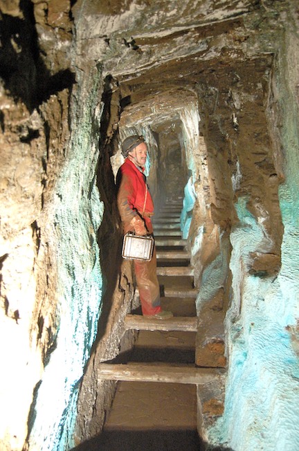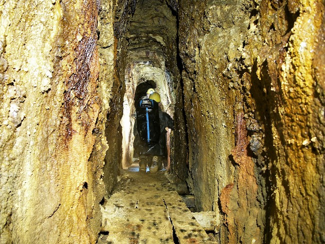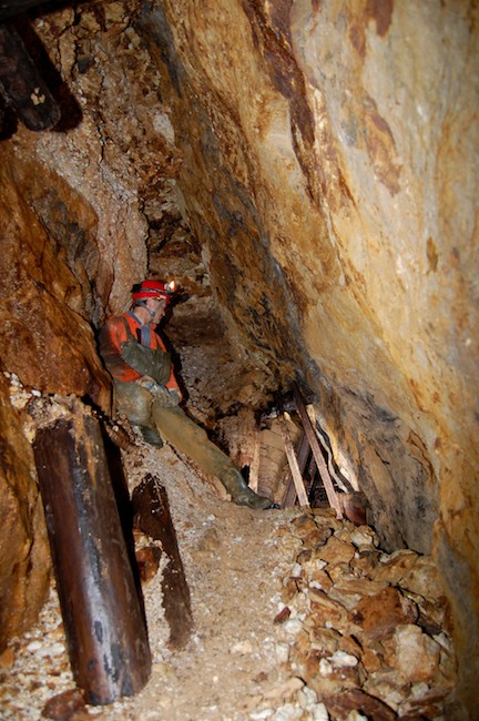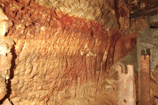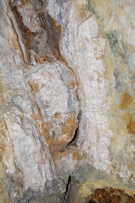 ![]() Streckenbereiche ohne Ausbau sind von durch Arsenmineralien zersetztem Nebengestein gezeichnet. |