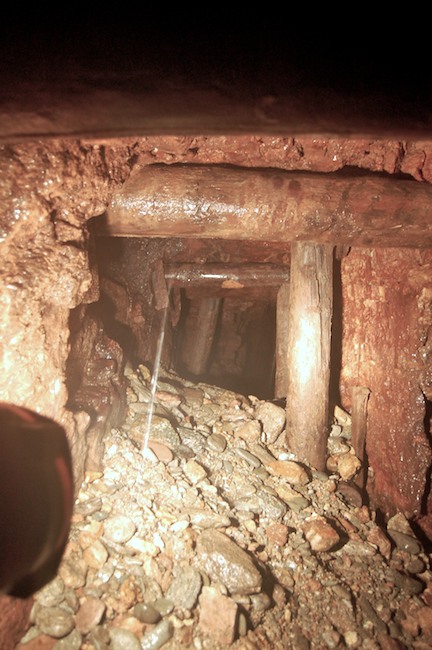 ![]() Auf dem Rückweg kurz vor dem „Gotthelf Schaller Schacht“. Im Hintergrund ist der Anfang der elliptischen Füllortmauerung zu sehen.